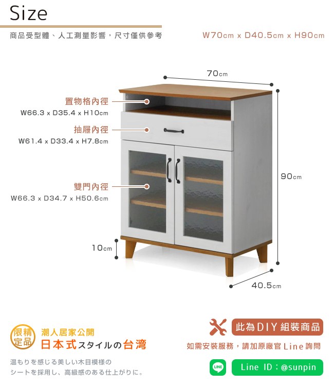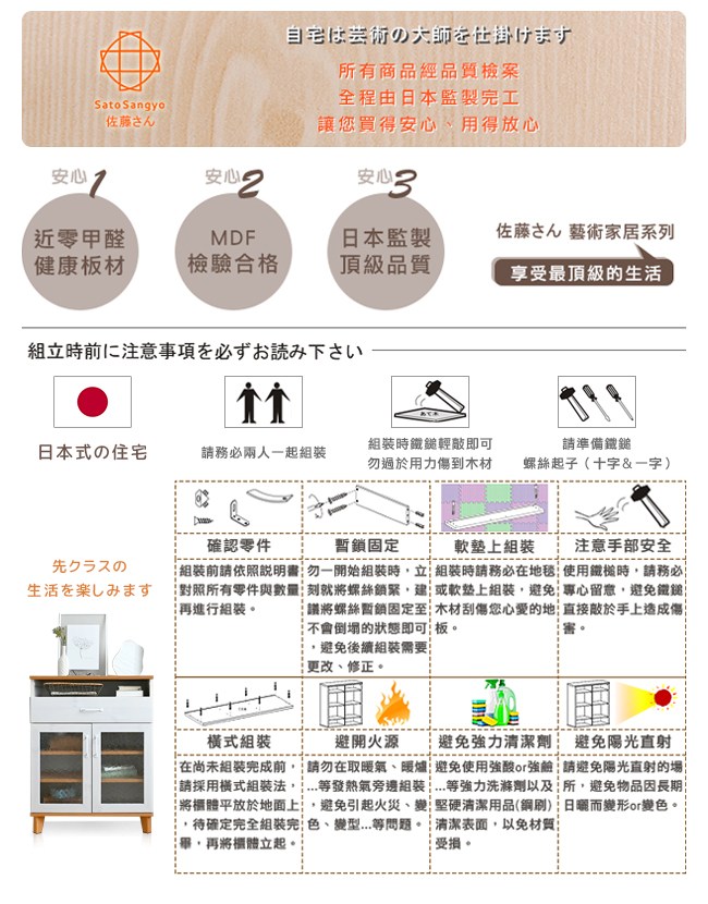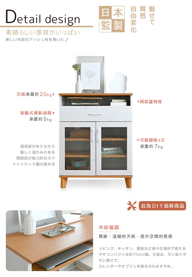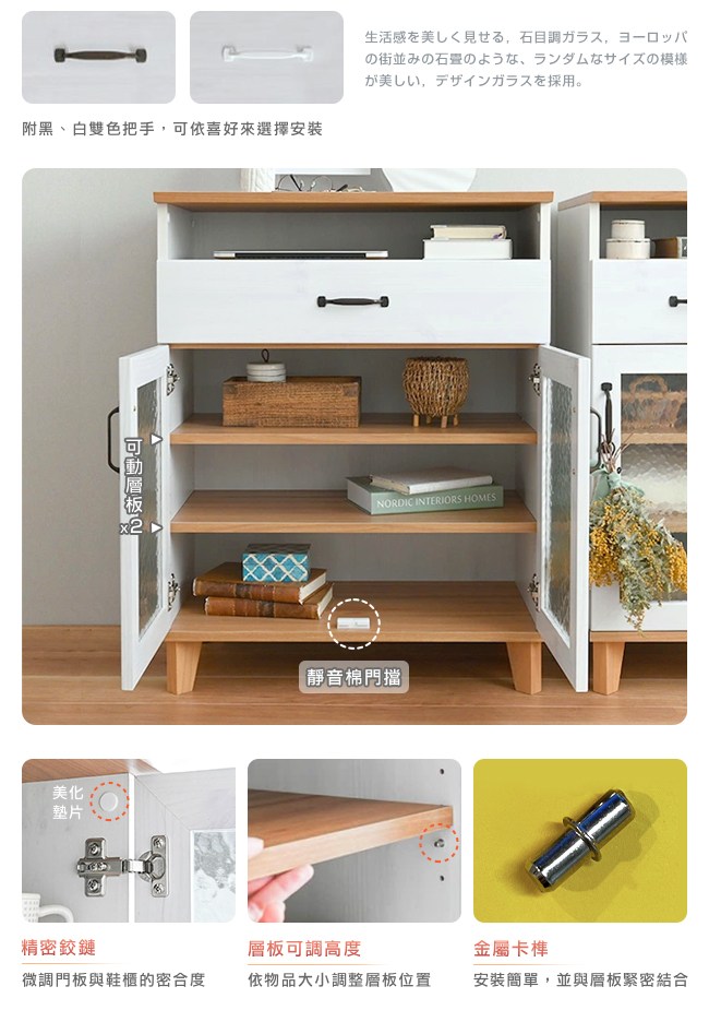 【Sato】日本家具品牌,職人專業工藝,講究獨特的細緻、追求質感的細節,完美演繹,優美居家的生活空間。小倉家具系列的特色之一,木紋天板帶來溫暖的感受,提升空間的質感。石紋玻璃仿若古歐洲的石板道路,簡約中點綴藝術氛圍。金屬復古把手,古典設計,增添品味,好抓握開關順手。並附黑、白雙色,可依喜好來選擇安裝。開放置物格,可放筆電、平板、書本、帳單等小物,方便日常生活使用。滾輪式滑軌抽屜,好推好拉,方便收納。可動層板2個,依物品大小調整位置,活用空間。美背設計,細膩別緻的質感。櫃體底座加高設計,方便清潔環境。實木腳高承重,經久使用。離地10cm,掃地機器人可打掃到櫃底。