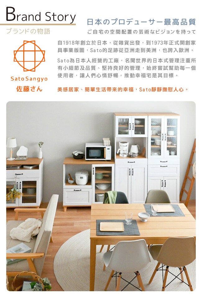自 1918 年創立於日本,從雜貨出發,到 1973 年正式開創家具事業版圖。【Sato】的足跡從亞洲走到美洲,自然也跨入歐洲。【Sato】為日本人經營的工廠,名聞世界的日本式管理,幾十年來磨家具一劍,注重所有細節與品質,堅持良好的管理。始終嘗試幫助每一個使用者,讓人們心情舒暢,推動幸福宅是其目標。美感居家、簡單生活帶來的小確幸,【Sato】靜靜撫慰煩躁的人心。
