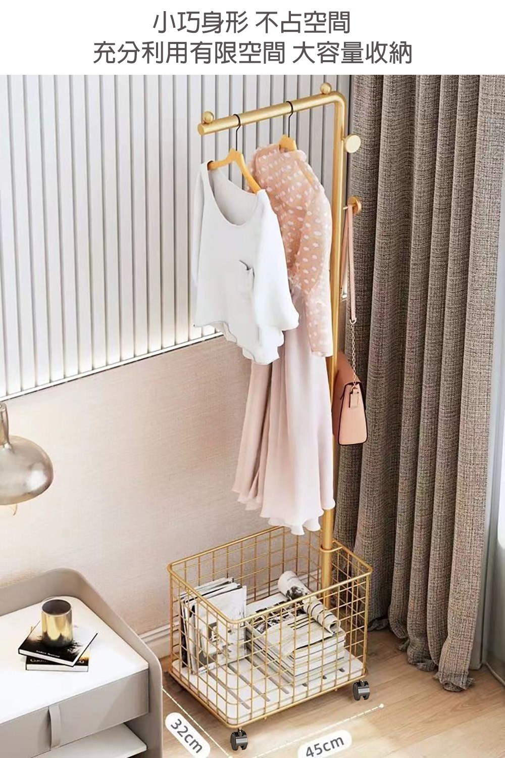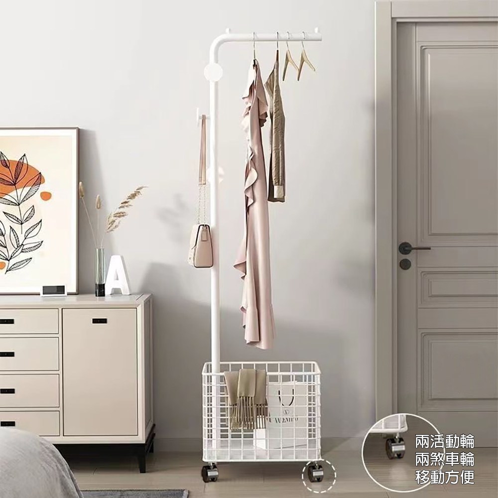 點我下載【居家生活Easy Buy】多功能籃網掛衣架-附輪(掛衣架 吊衣架 衣帽架 玄關架)圓形掛勾-黑色