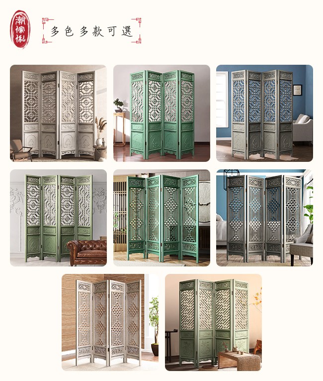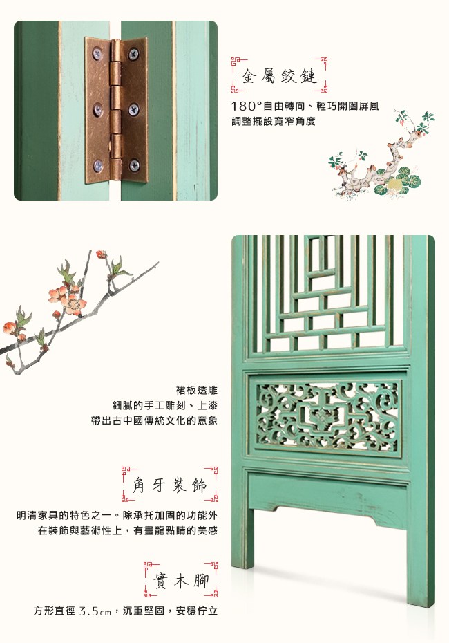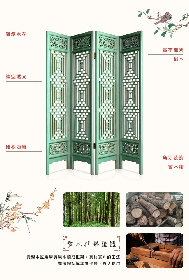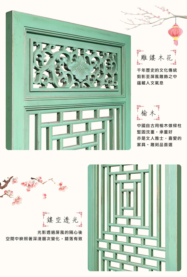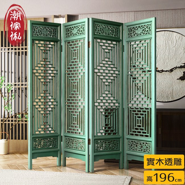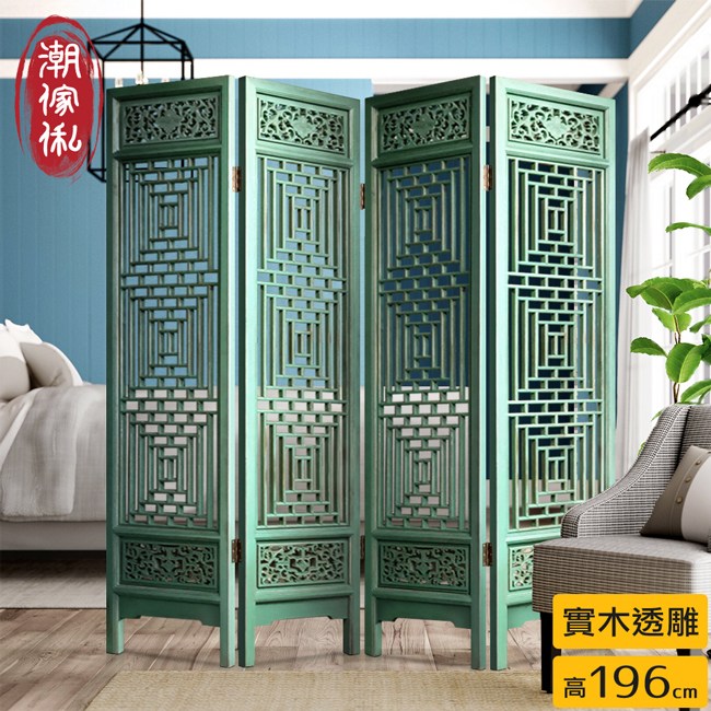 【C'est Chic】瑤台月實木透雕四片式屏風-風化藍綠