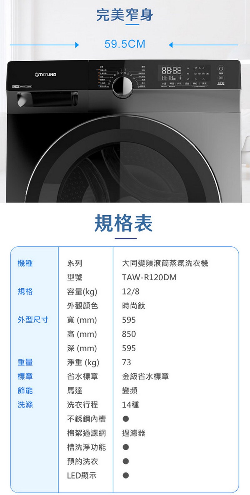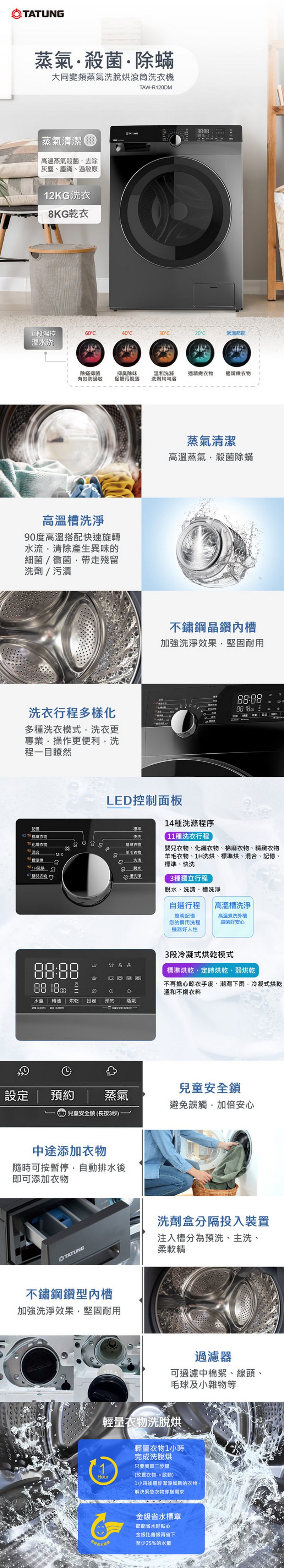 TATUNG大同12公斤變頻蒸氣洗脫烘滾筒洗衣機 TAW-R120DM~含基本安裝+舊機回收