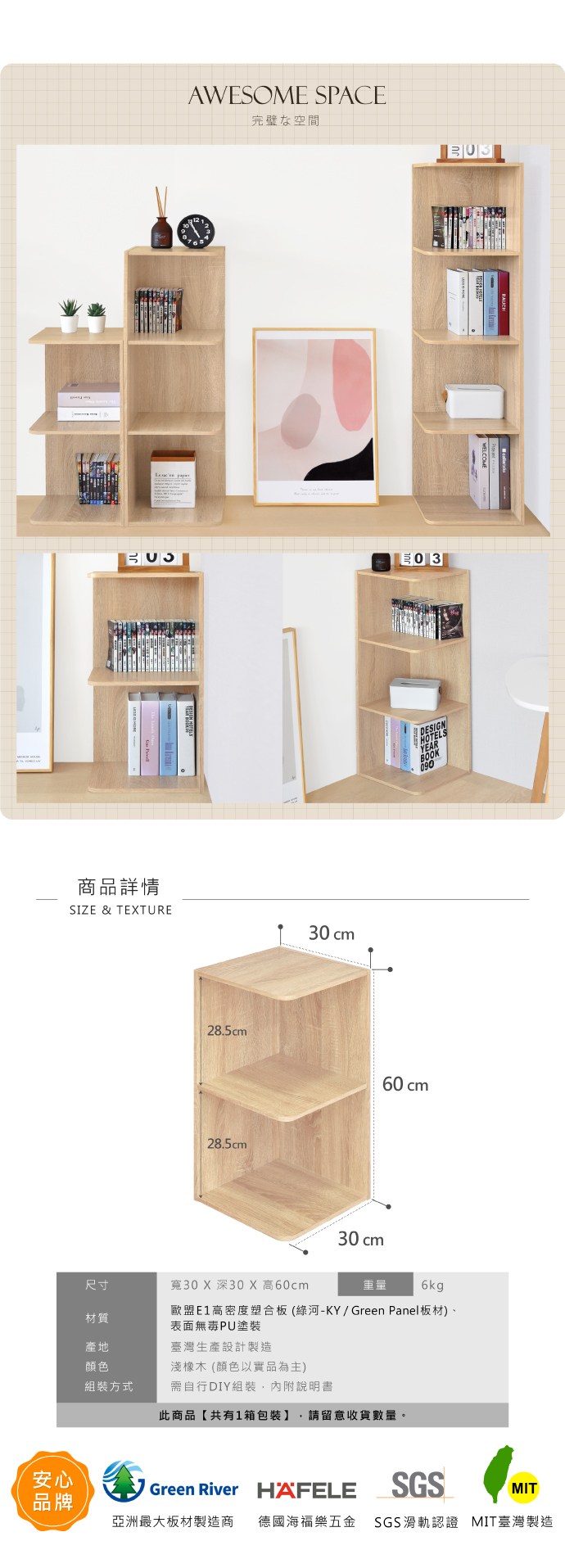 EASYHOME 格瑞思 六格厚板收納系統櫃 2068 灰黑布紋 + 原木色 59.3 x 29.3 x 93.6cm