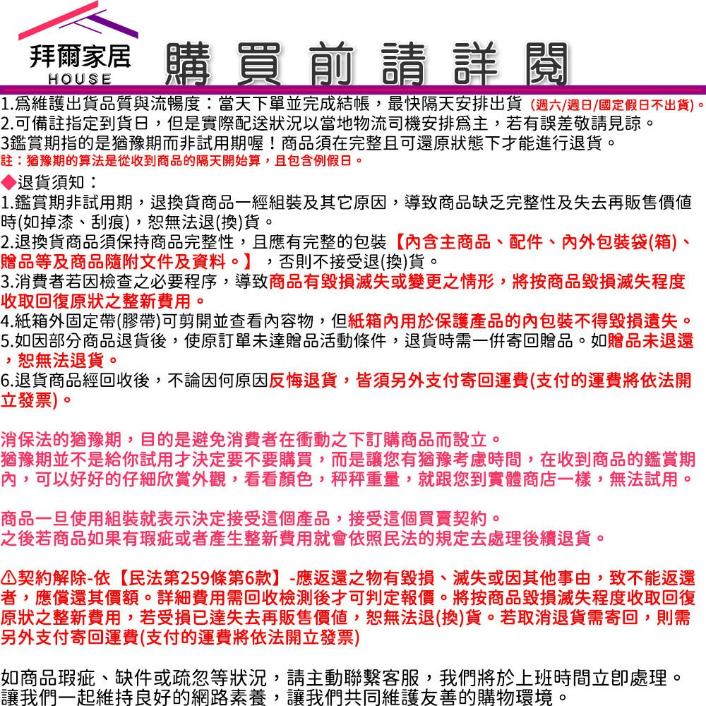 ● 7天鑑賞期非試用期,商品一經使用或組裝後,恕無法辦理退換貨。