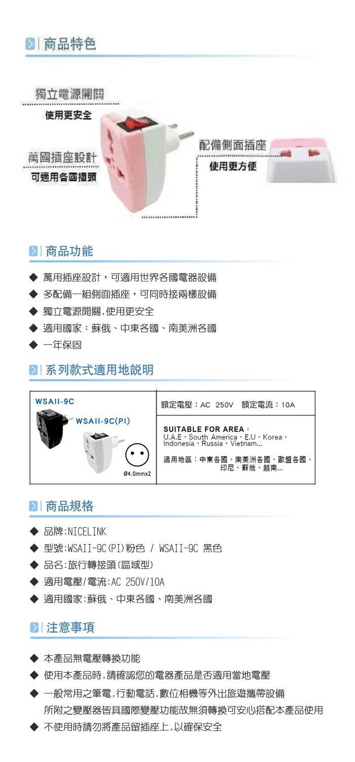 NICELINK 旅行轉接頭-區域型 3插座款 韓國/德國/法國/印尼 WAVIII-9(SB)