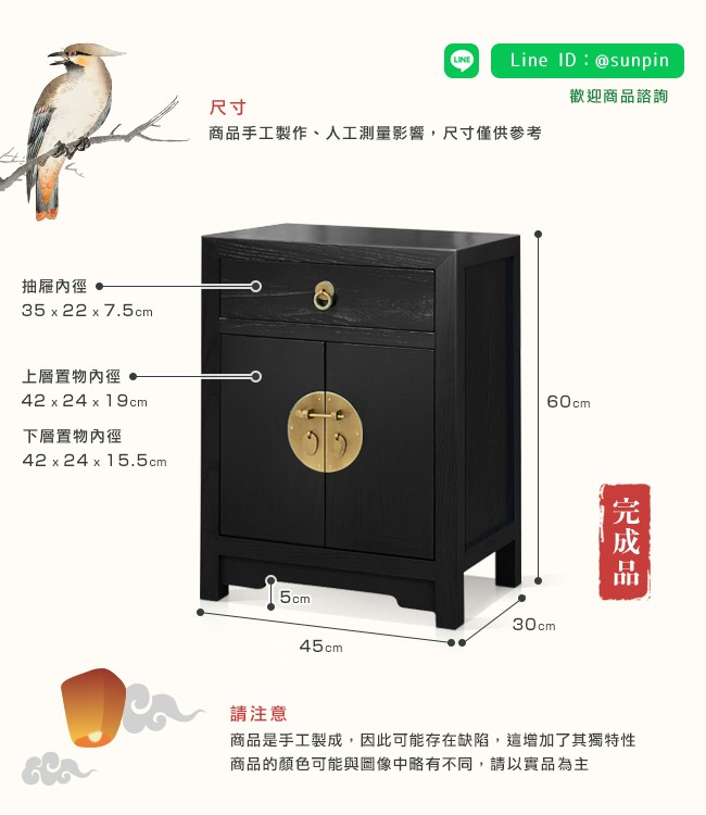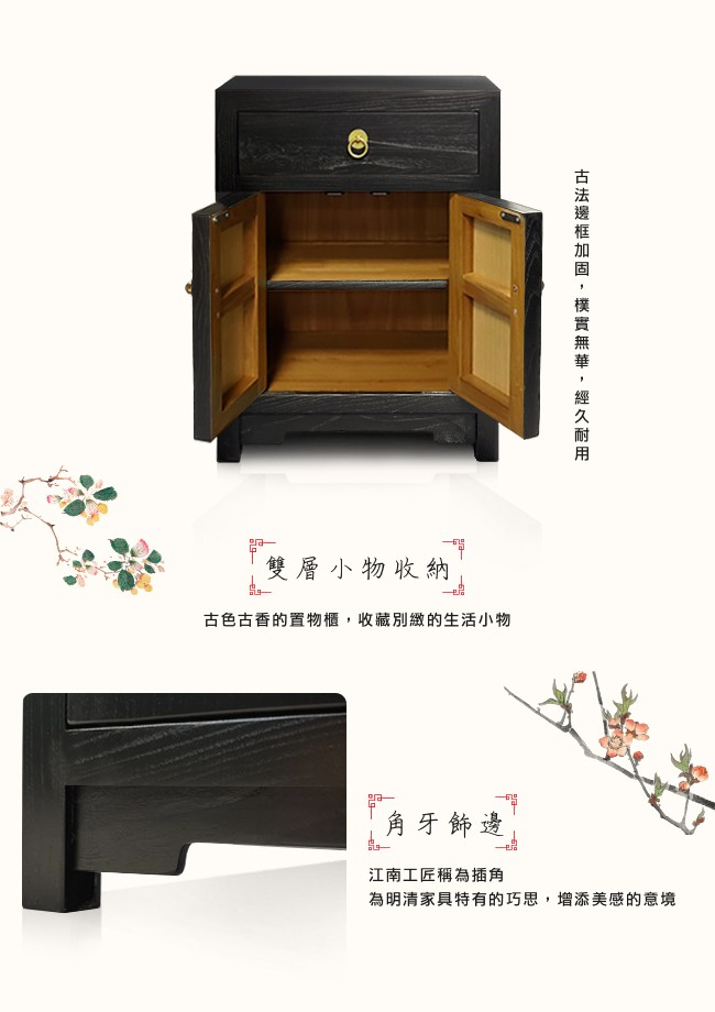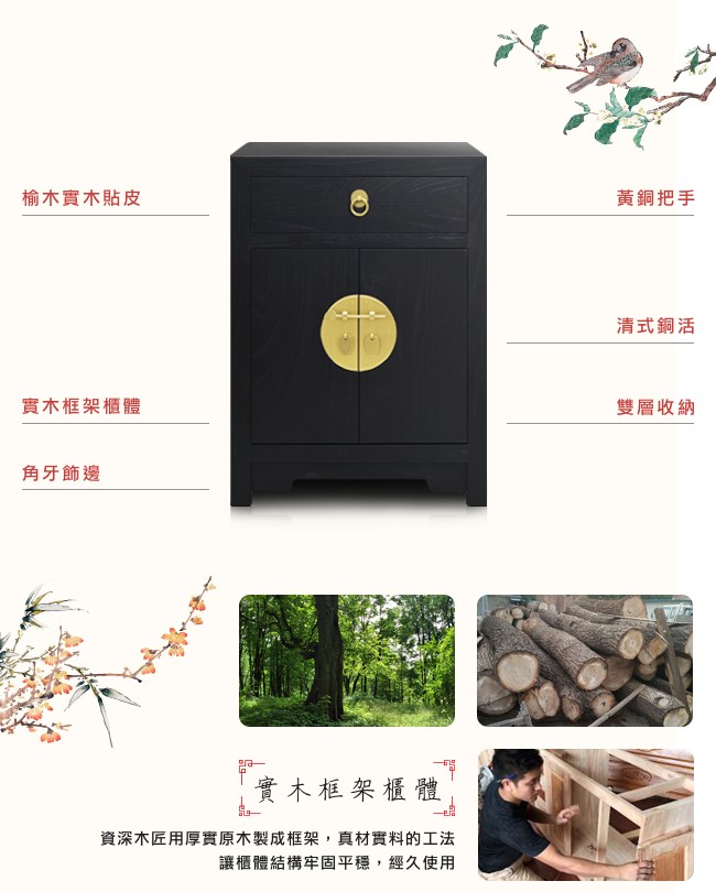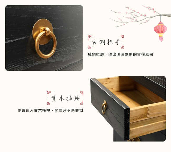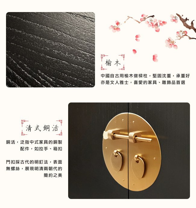 中國自古用榆木作樑柱,質地堅固沈重,承重好,亦是文人雅士,喜愛的家具、雕刻品首選。資深木匠用厚實原木製成框架,真材實料的工法,讓櫃體結構牢固平穩,經久使用。深邃木紋天板,帶來森林的安穩氛圍,觸感細膩,質感不凡。古法門邊框加固,樸實無華,經久耐用。實木抽屜,側邊嵌入實木橫桿,開關不易傾倒。清式銅活,門叩採古代的明釘法,表面無螺絲,展現明清兩代的簡約之美。古法門邊框加固,樸實無華,經久耐用。古色古香的雙層儲物櫃,收納井然有序。角牙飾邊,江南工匠稱為插角。為明清家具特有的巧思,增添美感的意境。