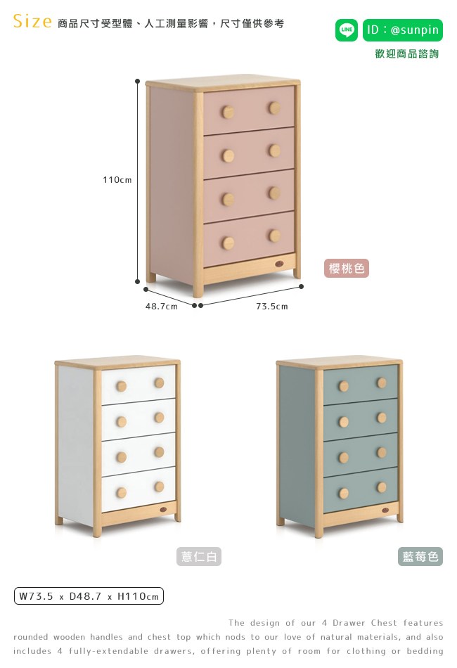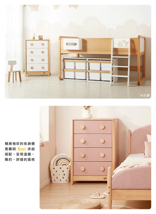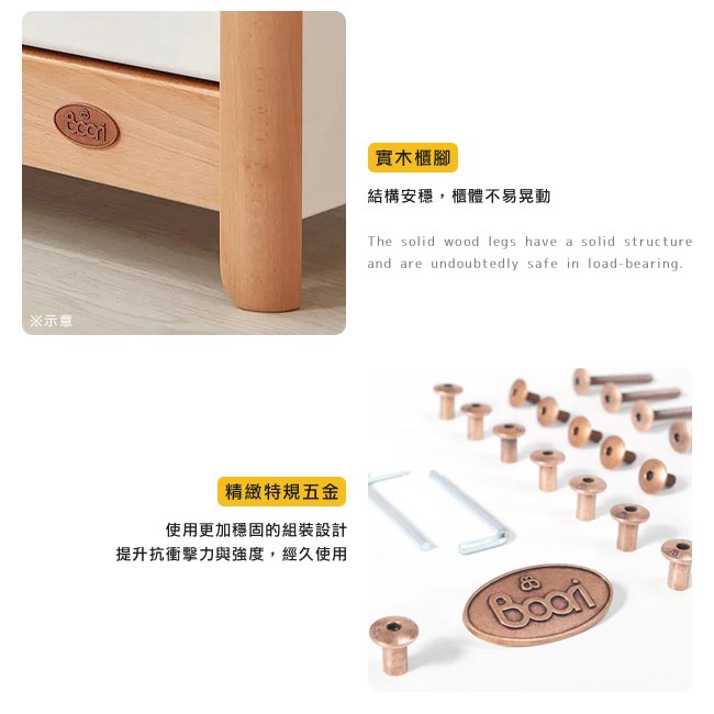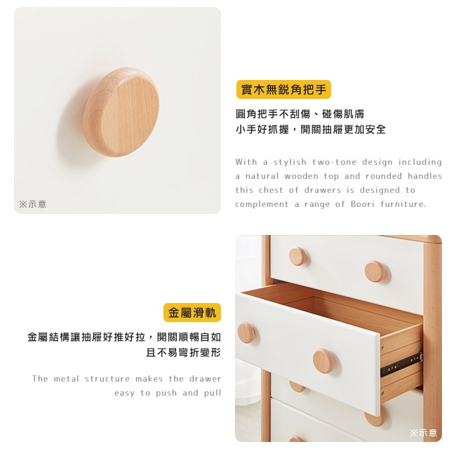 專為兒童所設計的置物櫃,將衣物、用品分門別類的收納整齊,讓孩子的生活習慣,從小有條不紊。實木天板承重好,不易下陷。實木框架堅固耐用。實木圓角把手不刮傷、碰傷肌膚,小手好抓握,開關抽屜更加安全。抽屜的金屬滑軌好推好拉,開關順暢自如,且不易彎折變形。實木櫃腳讓結構安穩,櫃體不易晃動。
