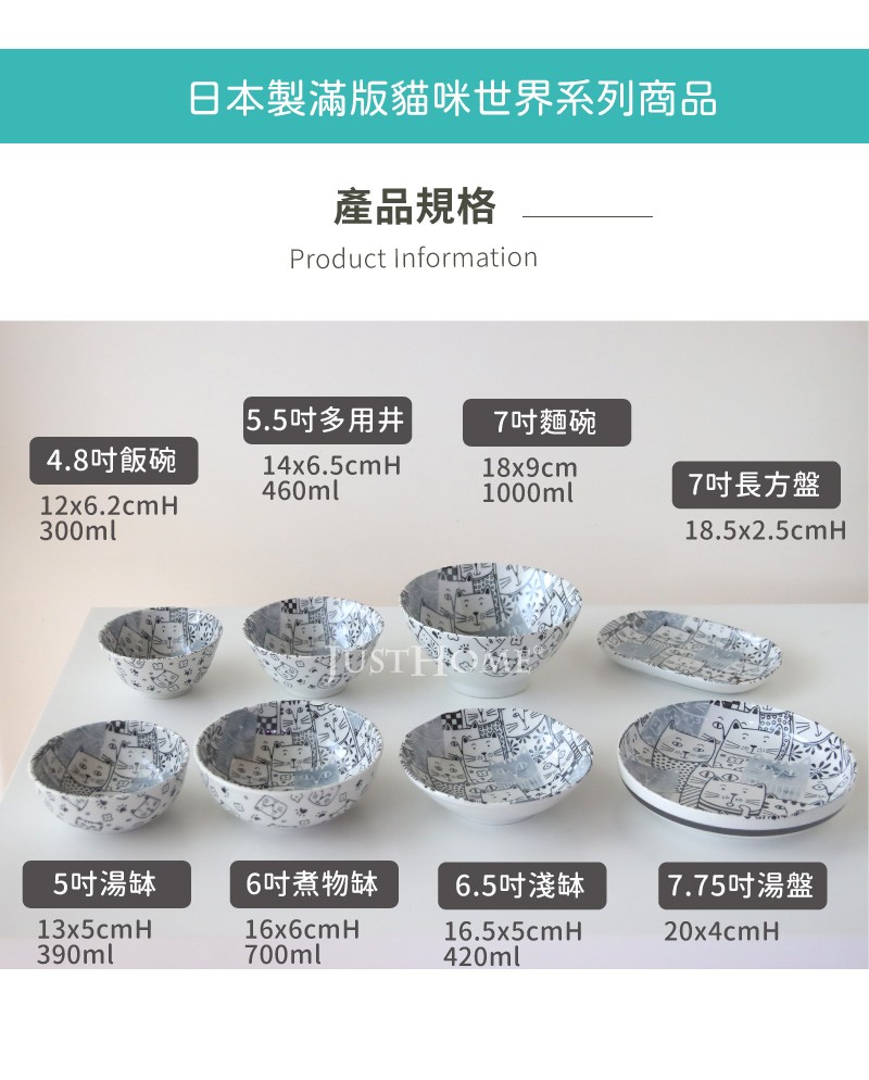 JUST HOME 日本製貓咪家族陶瓷7吋長方盤4件組 18.7 x 12.7 x 2.5cm 灰色 + 白色 1組