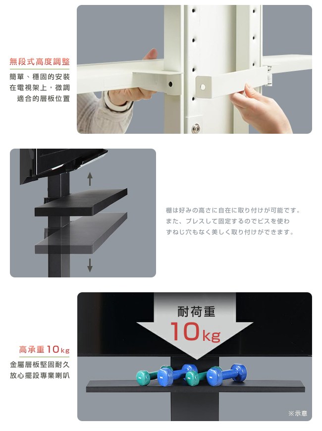 提升大電視觀影體驗的喇叭,該如何擺設,才能呈現出高音質的饗宴呢?依自己的喜好,無段式調整高度的 R3 專用層板架,讓聲波與您保持水平,環繞效果更具深度,並提升居家質感氛圍,讓電視不再枯燥乏味,而是獨特品味。使用鋼結構,最高承重 10kg,堅固耐久,放心擺設專業喇叭。