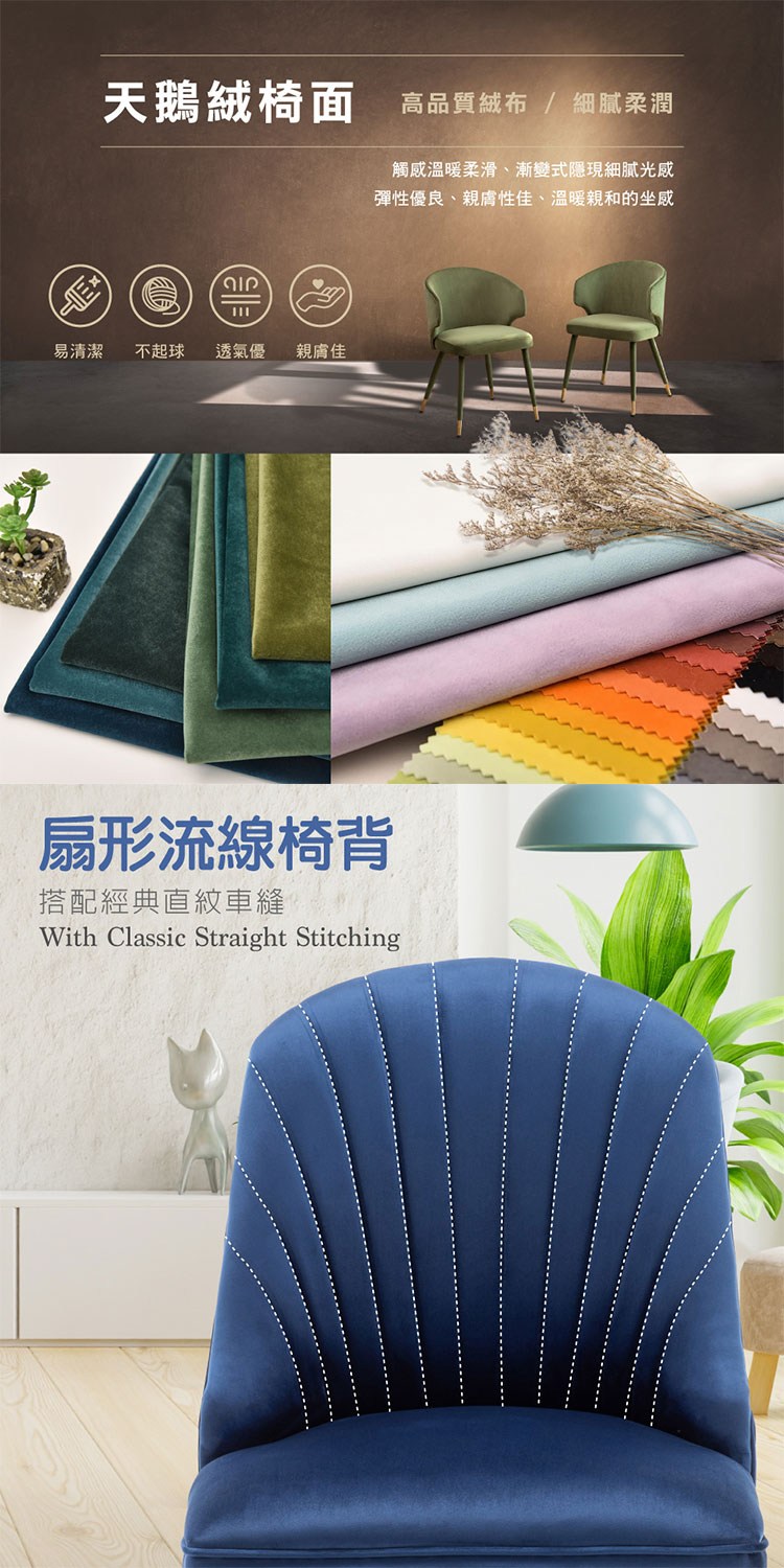 台灣與歐美同步販售、美規設計,低調而又不失華麗的天鵝絨座面,扇形流線椅背搭配經典直紋車縫,