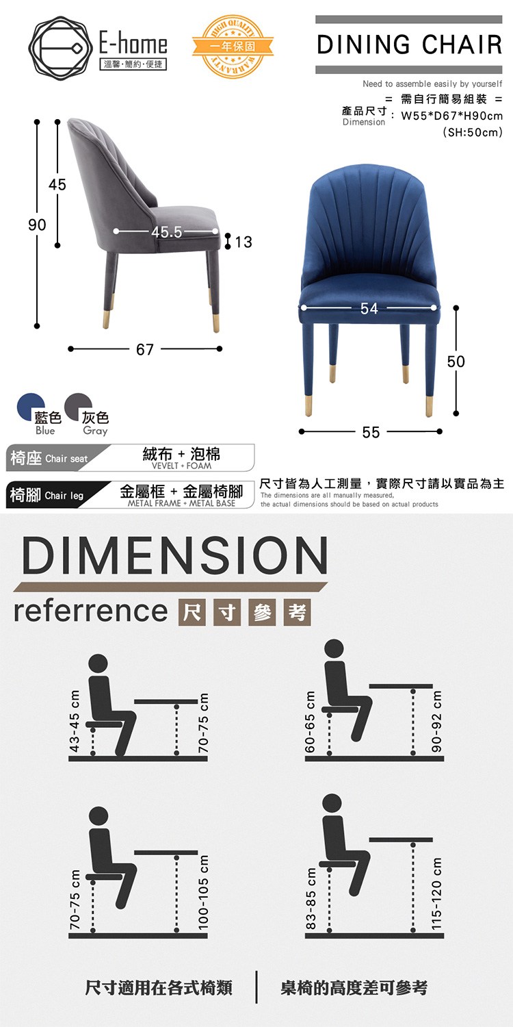 E-home Olivia奧利維亞高級絨布包金腳休閒餐椅-兩色可選