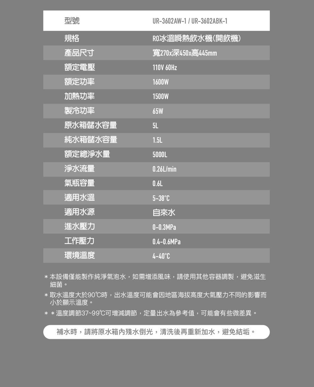 【賀眾牌】跨世代輕盈氣泡飲水機 UR-3602AW-1 (免安裝/氣泡/冰溫熱/雙UV殺菌/RO)