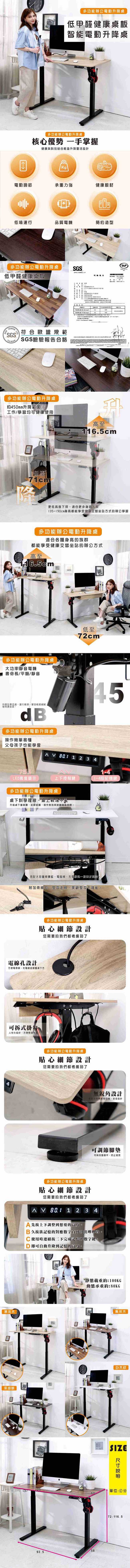 智能實用的電動升降桌,各個時期都可使用的高度,當您久坐想伸展一下筋骨時,也能調整桌面高度,讓您從坐變成站,變換一下您的姿勢,舒緩一下疲勞。LED螢幕清晰顯示數字,按鍵式調整升降,操作簡單,還有4段高度可記憶設定,設定您常使用高度,不用上上下下調整您要的高度。桌板設有線孔蓋,方便桌上抬燈或充電使用,桌下也設有集線槽和小掛籃,方便整理線路,桌下不會亂糟糟。另附有兩個掛勾,桌子左右兩邊皆可吊掛耳機、包包等物品。靜音馬達,升降時靜音又穩定,熬夜工作時也不怕吵到家人了。CP值高的桌子,從小學到工作都適用的高度,不用隨著身高而需更換桌子了,適合成長期的小孩,也適合會久坐的上班族。超值好用的桌子推薦給您。