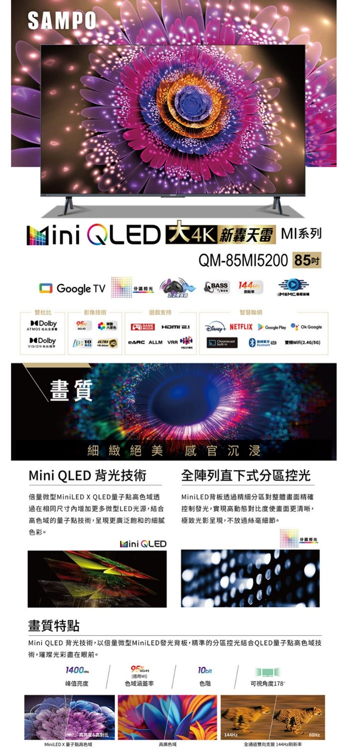 聲寶 SAMPO 85型4K HDR新轟天雷智慧聯網MINI QLED顯示器 QM-85MI5200