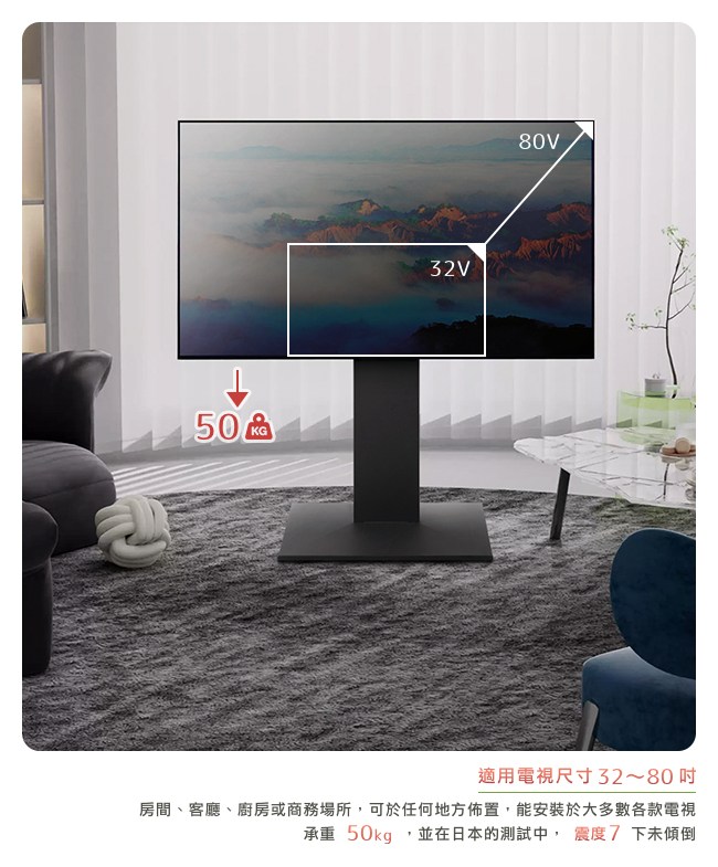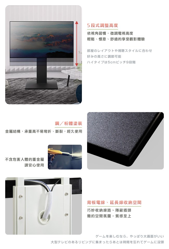 依個人視角習慣,可微調電視高度,擁有最舒適的觀影體驗。使用鋼結構,最高承重 50kg。並且日本試驗在震度 7 的情況下,相對於一般電視的擺放方式,更不易傾倒。因此可在任何場所佈置,如房間、客廳、廚房或商務空間。電視立架背面,可裝入延長線,讓電線井然有序。背板藏線設計,美化居家的空間。大片鋼製底座與防滑設計,強化抓地力與耐荷重,不易滑動,牢固穩定。