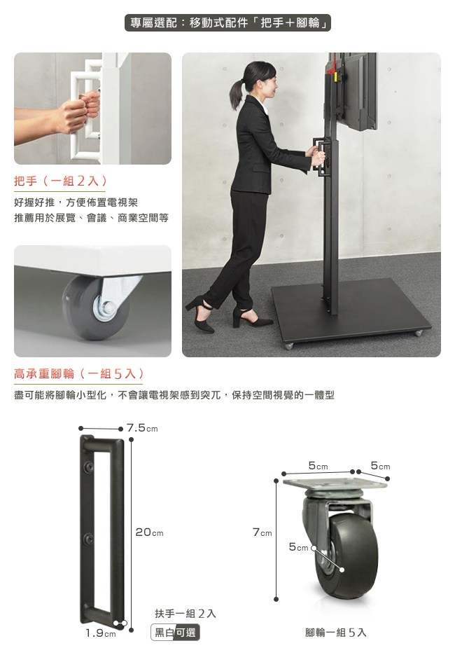 推薦選配移動式配件組:把手(一組 2 入)+腳輪(一組 5 入)。