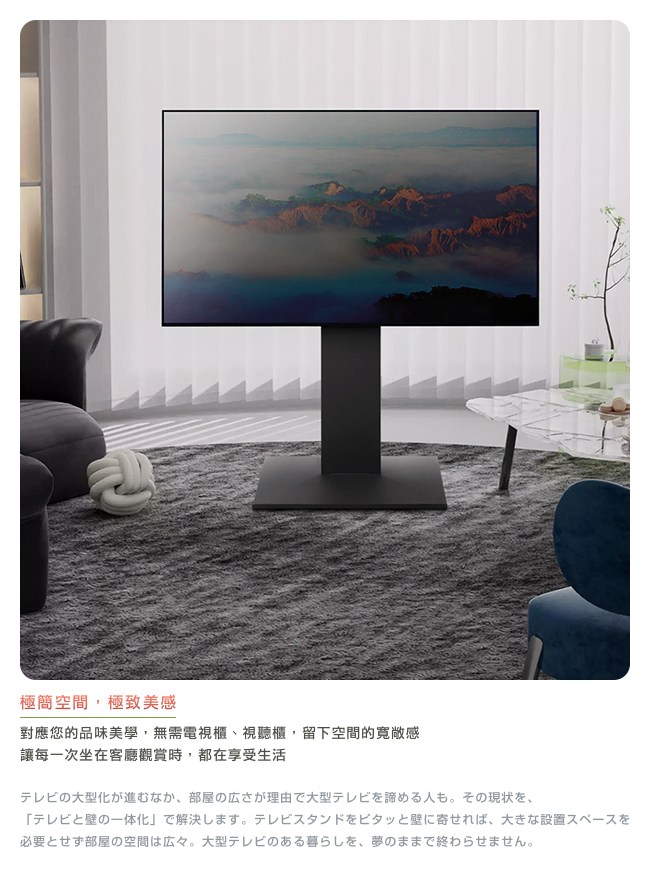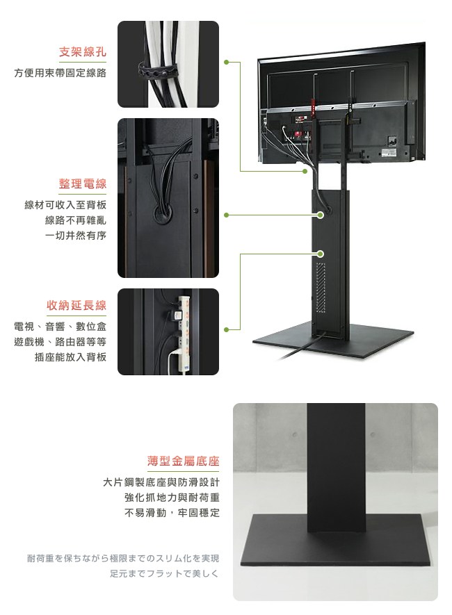 依個人視角習慣,可微調電視高度,擁有最舒適的觀影體驗。使用鋼結構,最高承重 50kg。並且日本試驗在震度 7 的情況下,相對於一般電視的擺放方式,更不易傾倒。因此可在任何場所佈置,如房間、客廳、廚房或商務空間。電視立架背面,可裝入延長線,讓電線井然有序。背板藏線設計,美化居家的空間。大片鋼製底座與防滑設計,強化抓地力與耐荷重,不易滑動,牢固穩定。