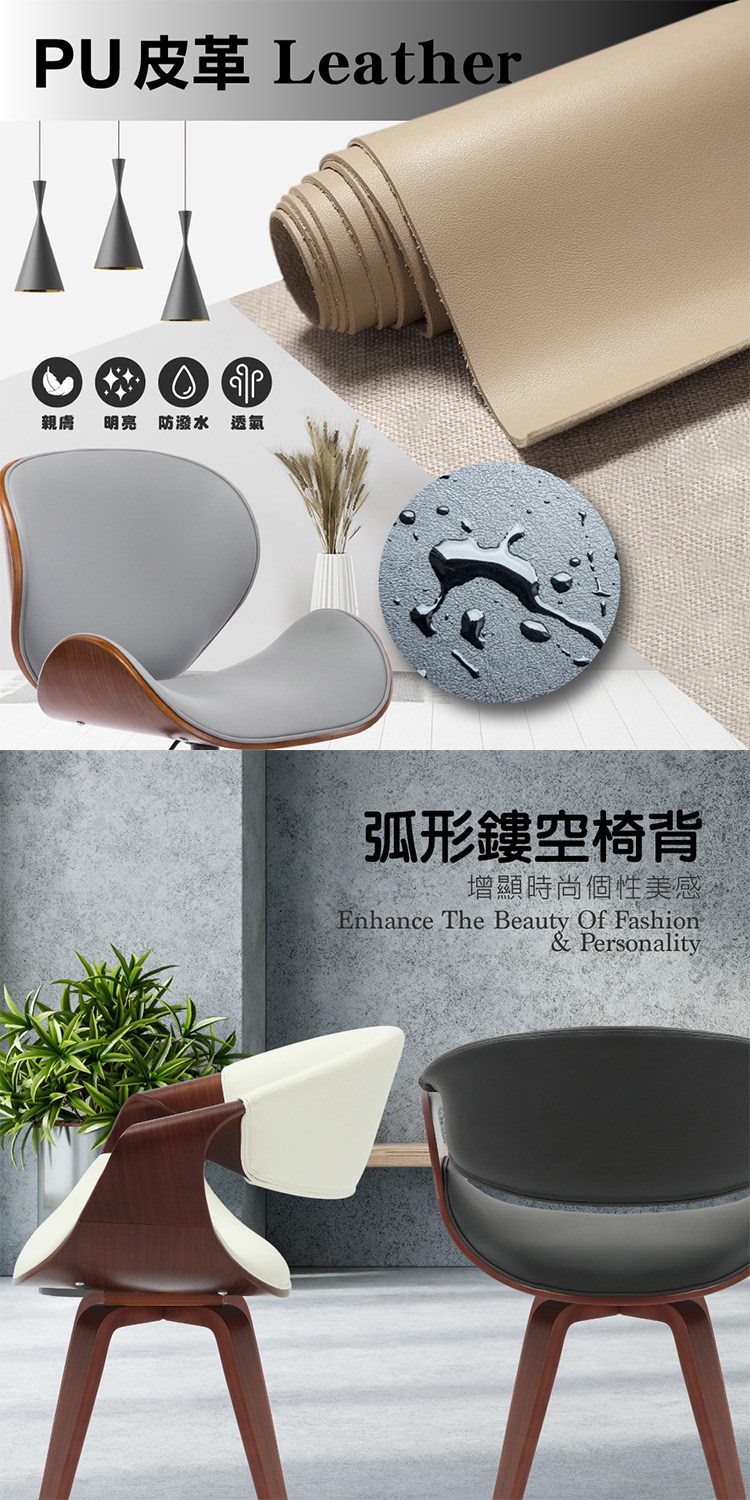 台灣與歐美同步販售、美規設計,防潑水PU皮座面,觸感佳易清潔,弧形鏤空椅背增顯時尚個性美感,