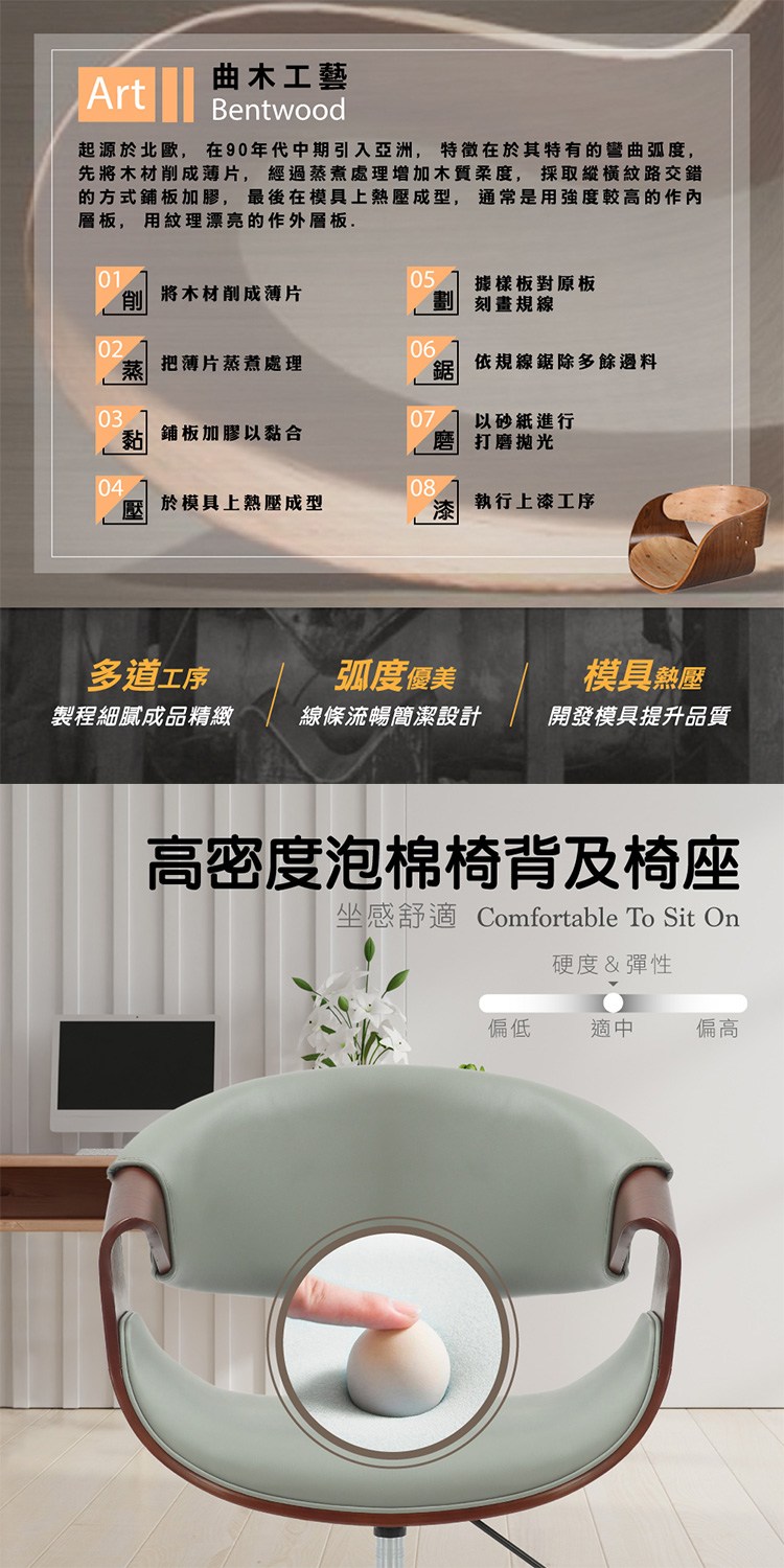內捲式扶手設計獨特美觀又實用,搭配獨特弧形曲木框架質感加乘,高密度泡棉椅背及椅座坐感舒適,