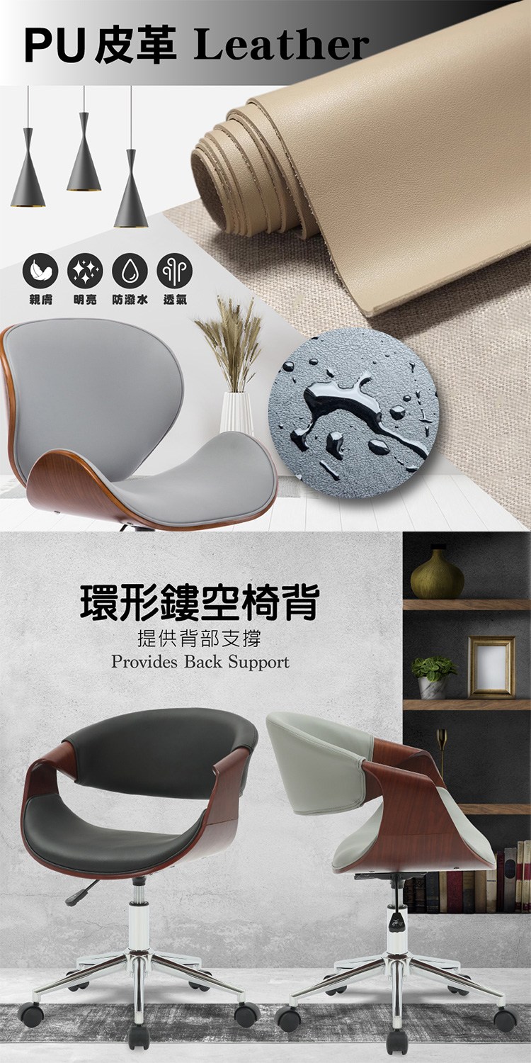 台灣與歐美同步販售、美規設計,防潑水透氣PU皮椅面、易於清潔,環形鏤空椅背設計提供背部支撐,