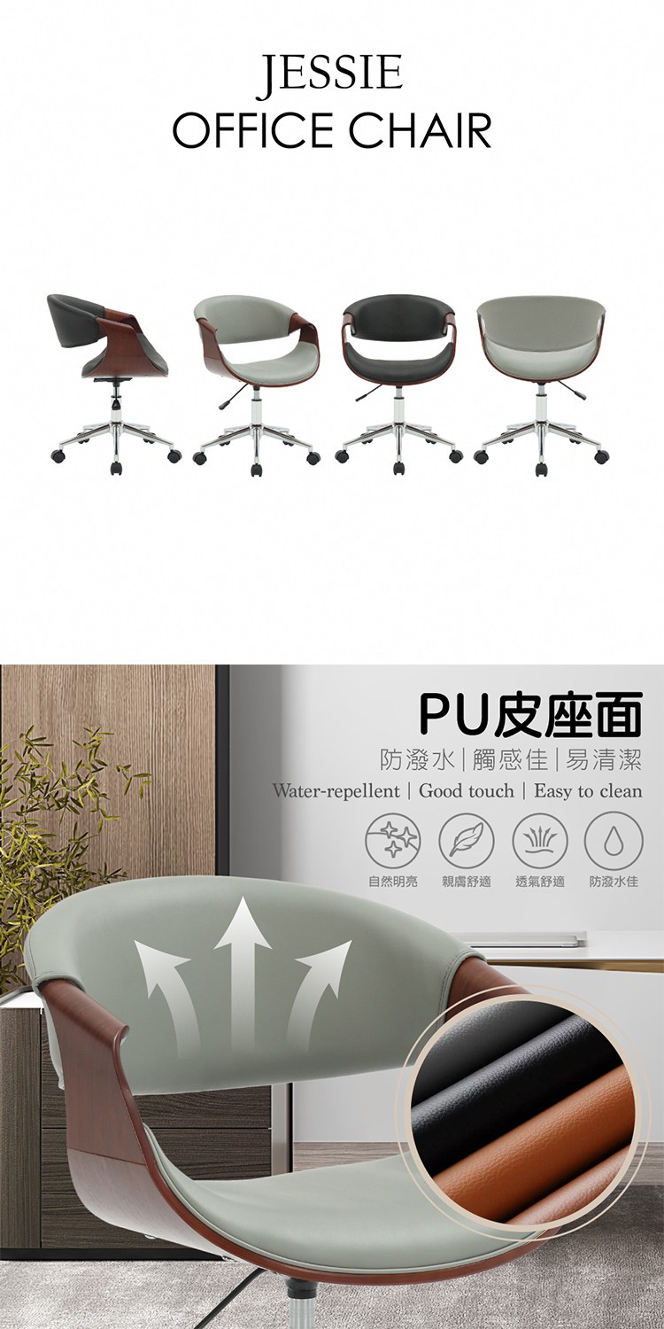 * 防潑水透氣PU皮椅面、易於清潔