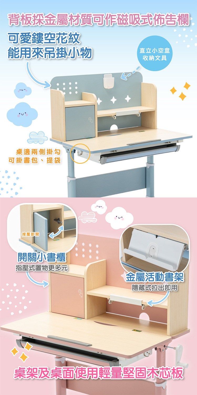 桌面附有PU材質書擋書本不滑落,便利置物抽屜,分隔收納好整理,桌邊二側掛勾可吊掛書包與提袋,