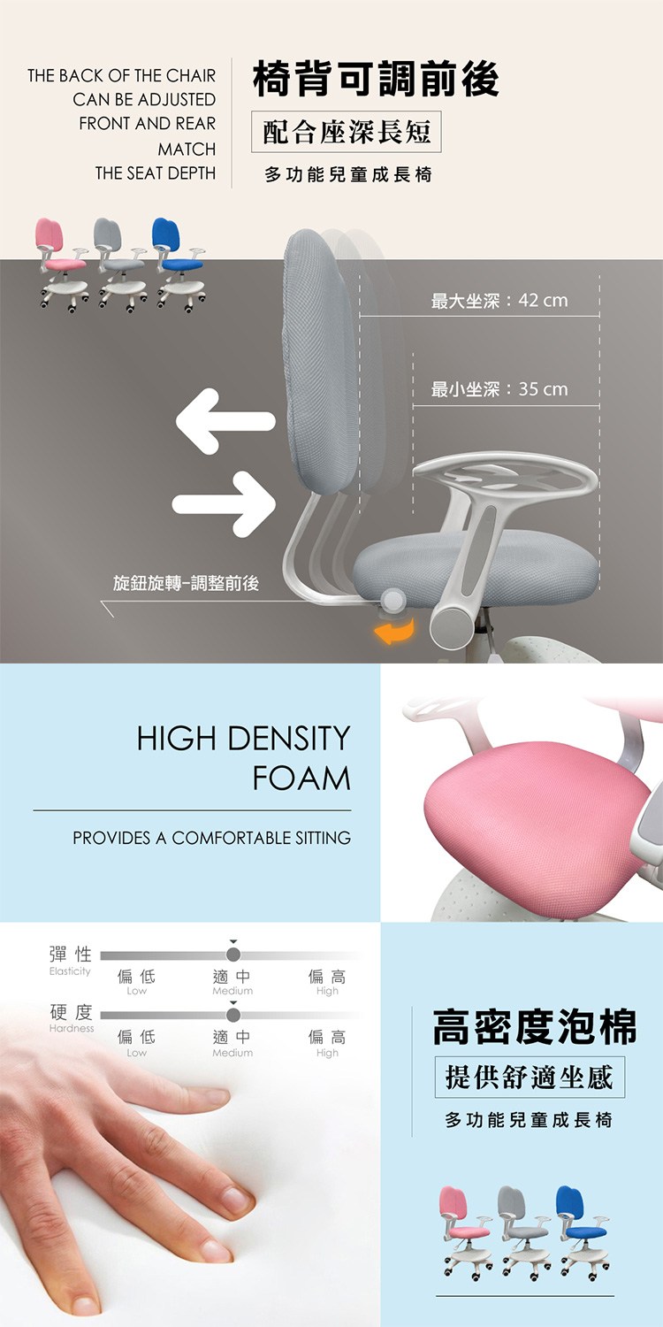 可調前後伸縮椅背配合座深長短,泡棉椅背及坐墊,提供舒適坐感,扶手可向後旋轉、方便收於桌下,