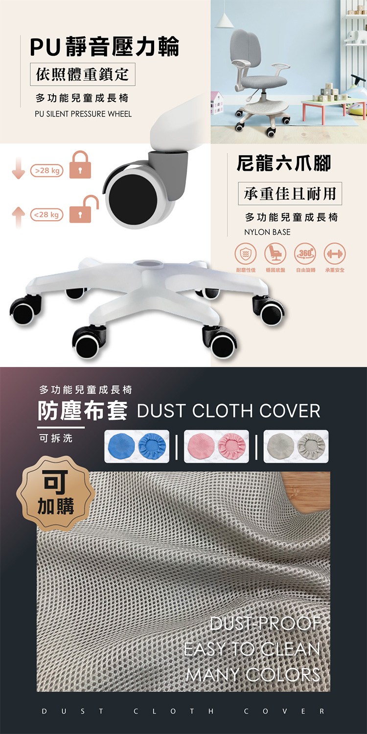 配備PU靜音壓力輪、固定重鎖定,可加購可拆洗防塵布套避免污漬,可加購A級無旋轉固定式氣壓棒,