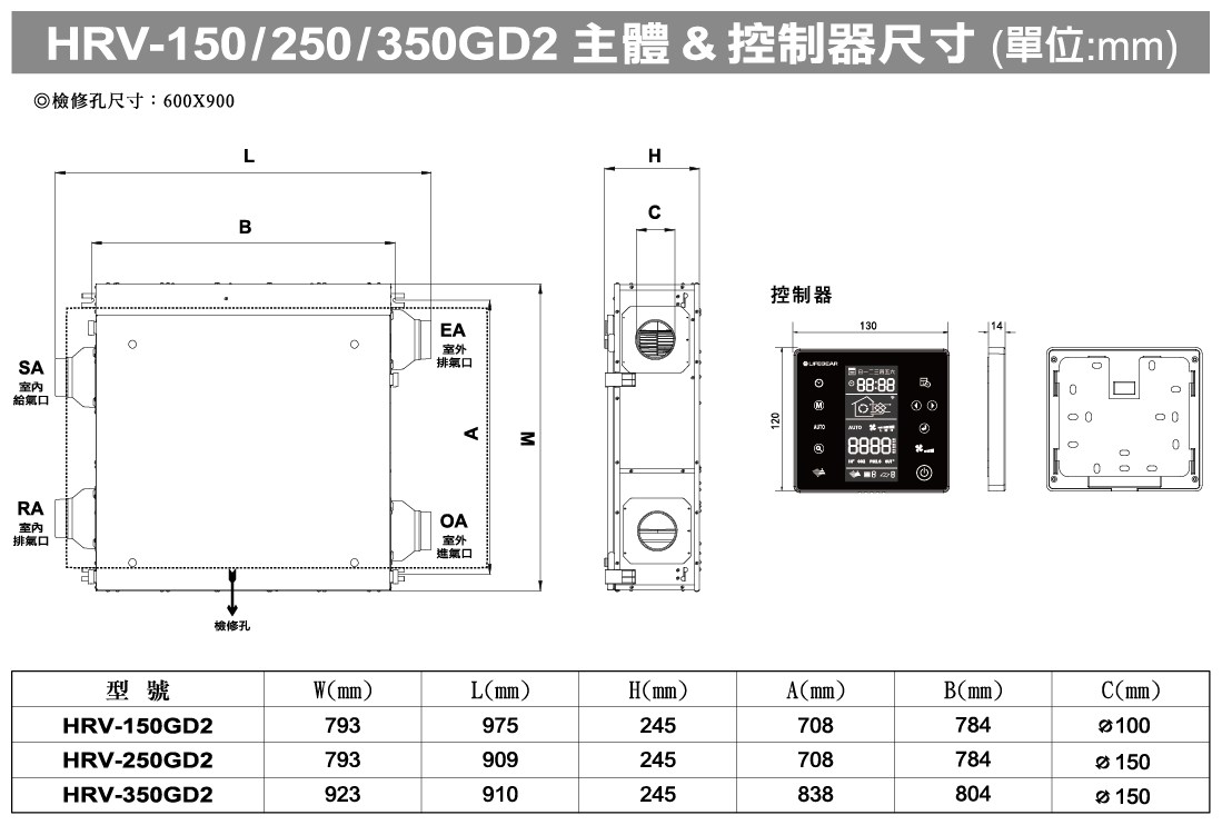 【樂奇LIFEGEAR】隱藏式全熱交換機 HRV-350GD2 直流變頻 數位液晶控制 含控制面板 電壓220V (不含安裝)