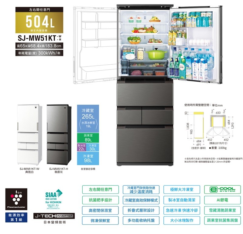 點我下載113/9/30 前登錄送立扇~ 夏普 504L SJ-MW51KT 五門左右開 變頻冰箱W-白