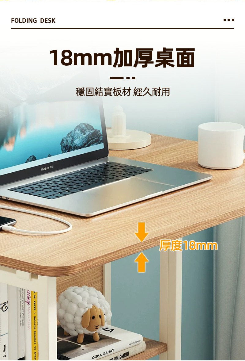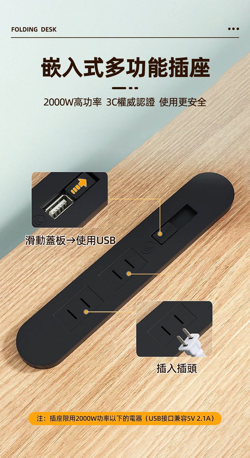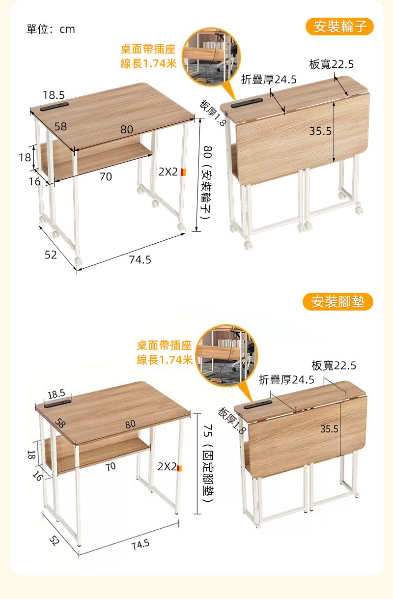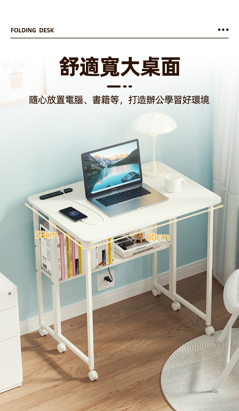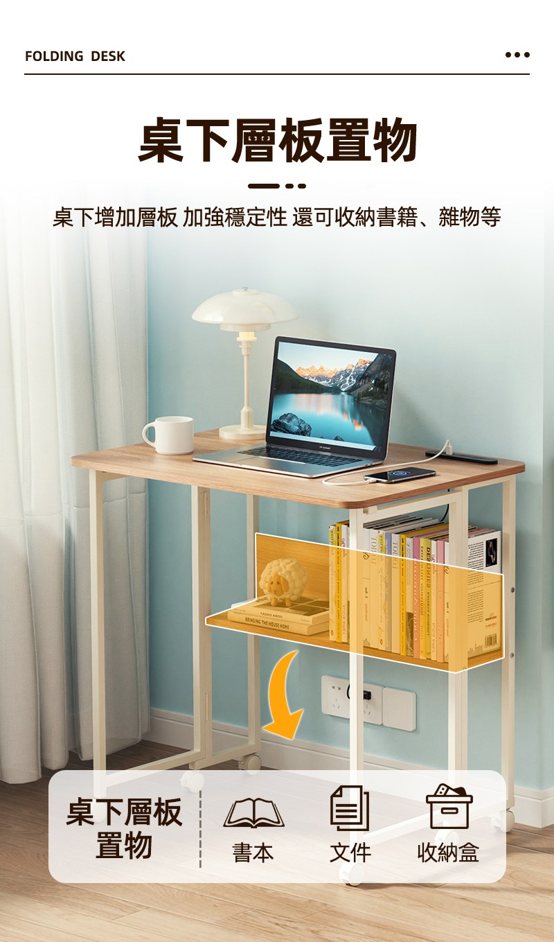 【慢慢家居】SGS低甲醛-秒收帶插座可移動置物摺疊書桌 80x58x75/80cm (邊桌 電腦桌 移動桌 摺疊桌)置物插座摺疊桌80cm-木紋