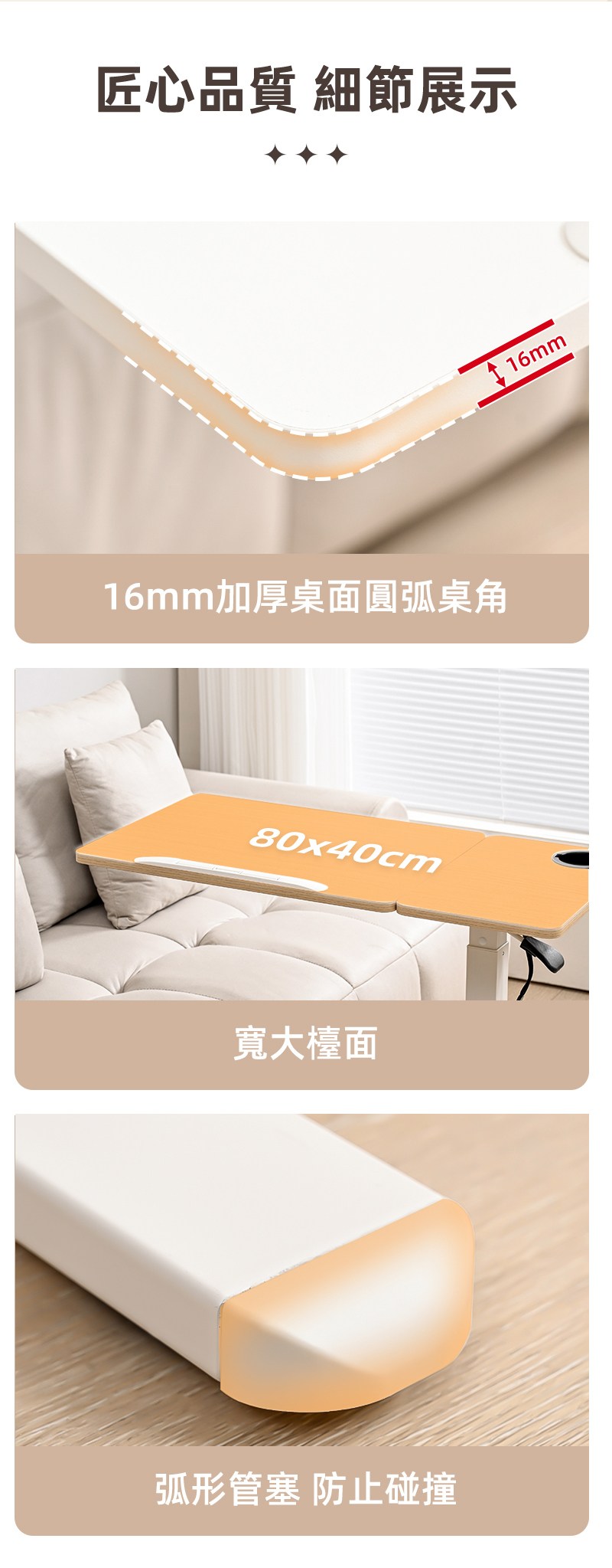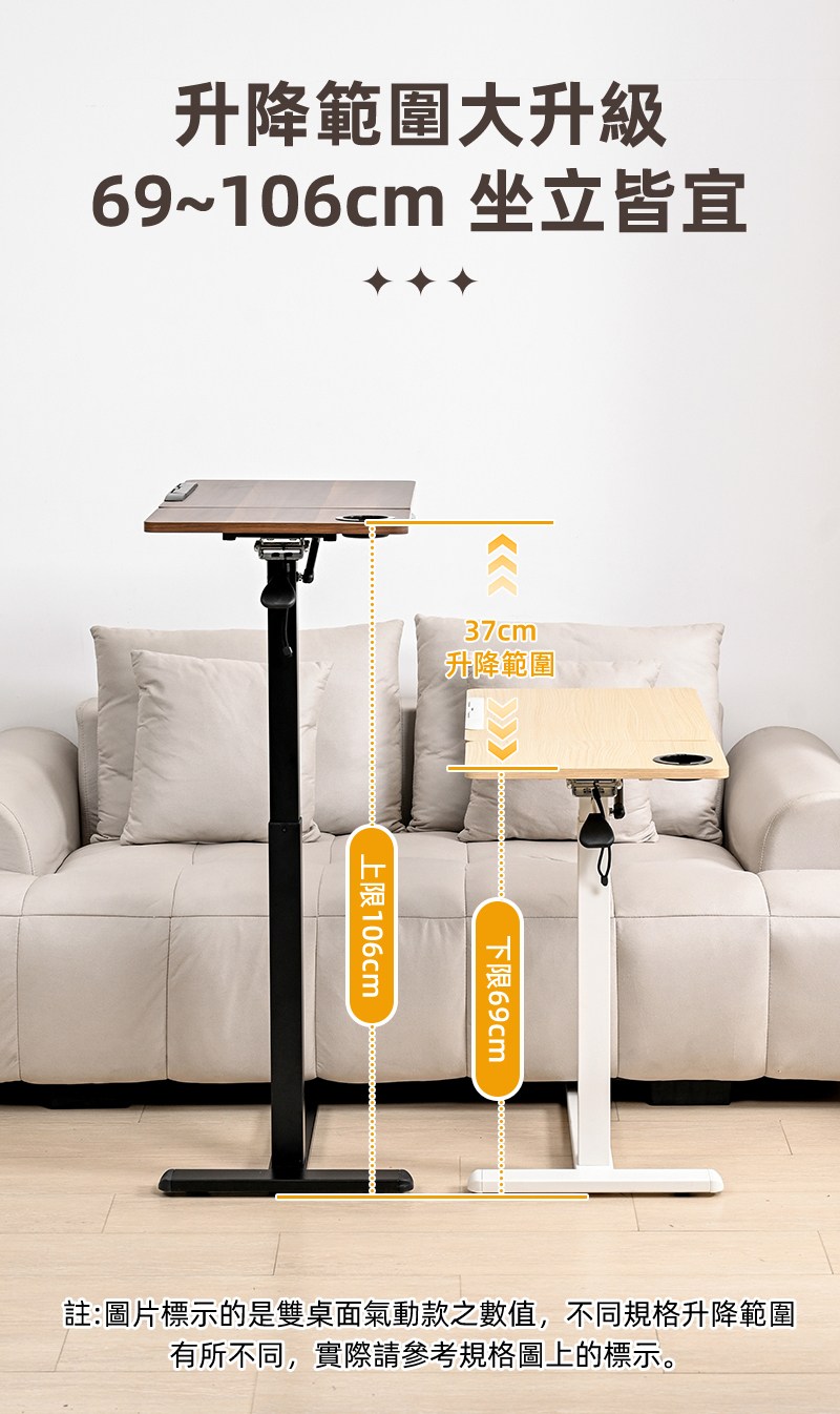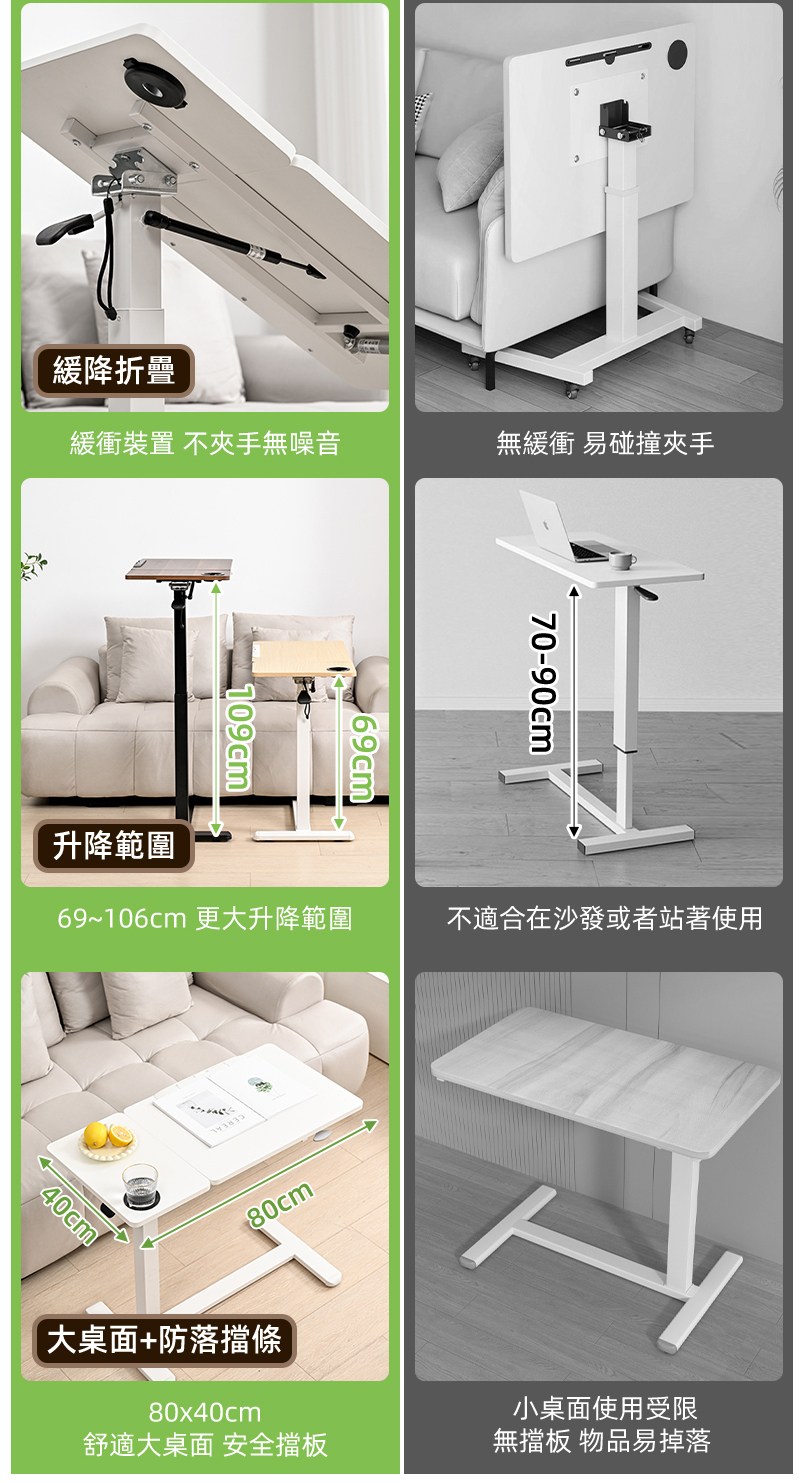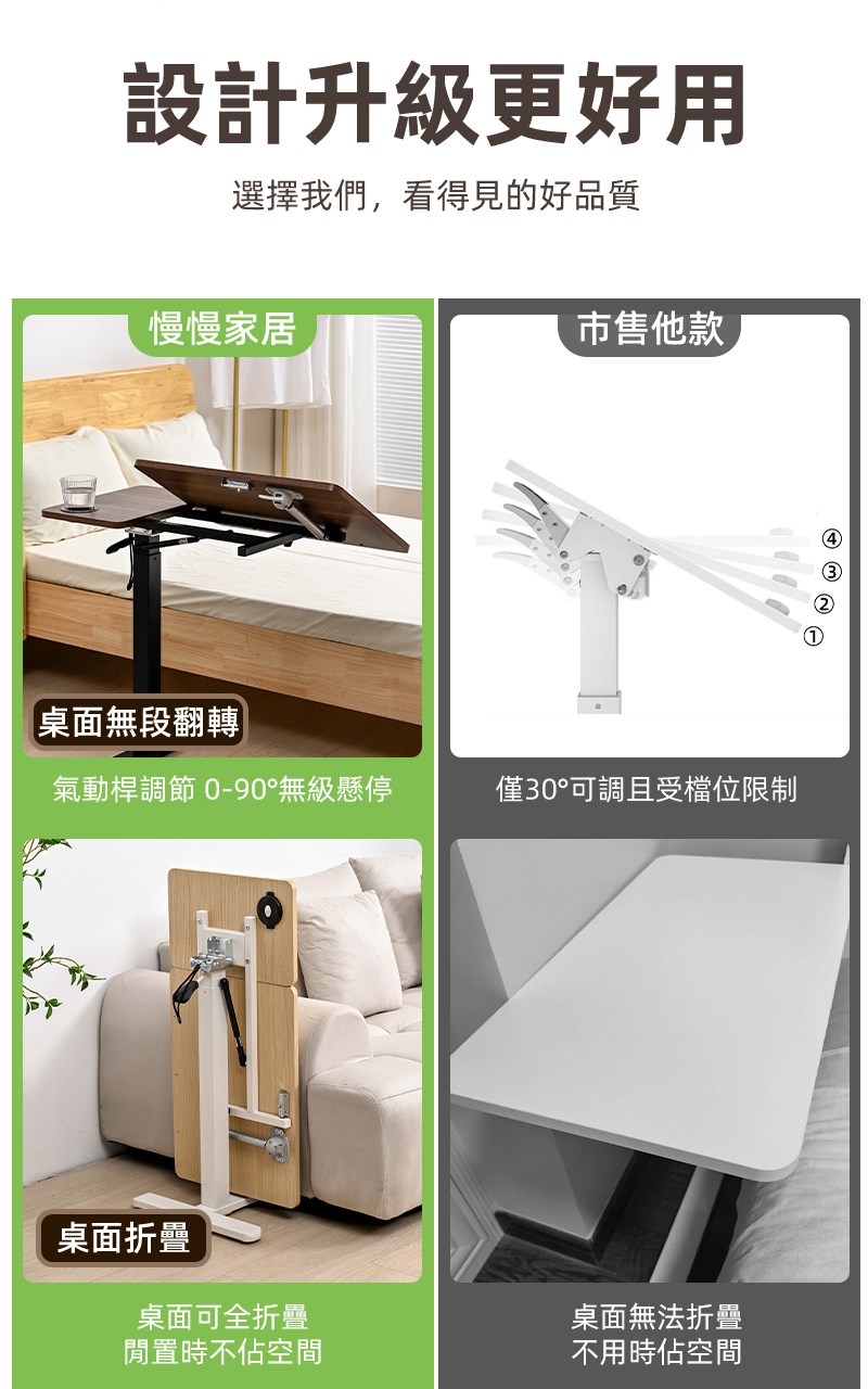 【慢慢家居】ALL in 1-無段翻轉+緩降摺疊 雙桌面可移動氣壓式升降邊桌 (SGS低甲醛 大桌面80x40)現貨在台