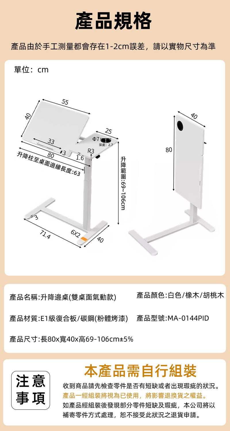 【慢慢家居】ALL in 1-無段翻轉+緩降摺疊 雙桌面可移動氣壓式升降邊桌 (SGS低甲醛 大桌面80x40)雙桌面氣動升降桌-白色