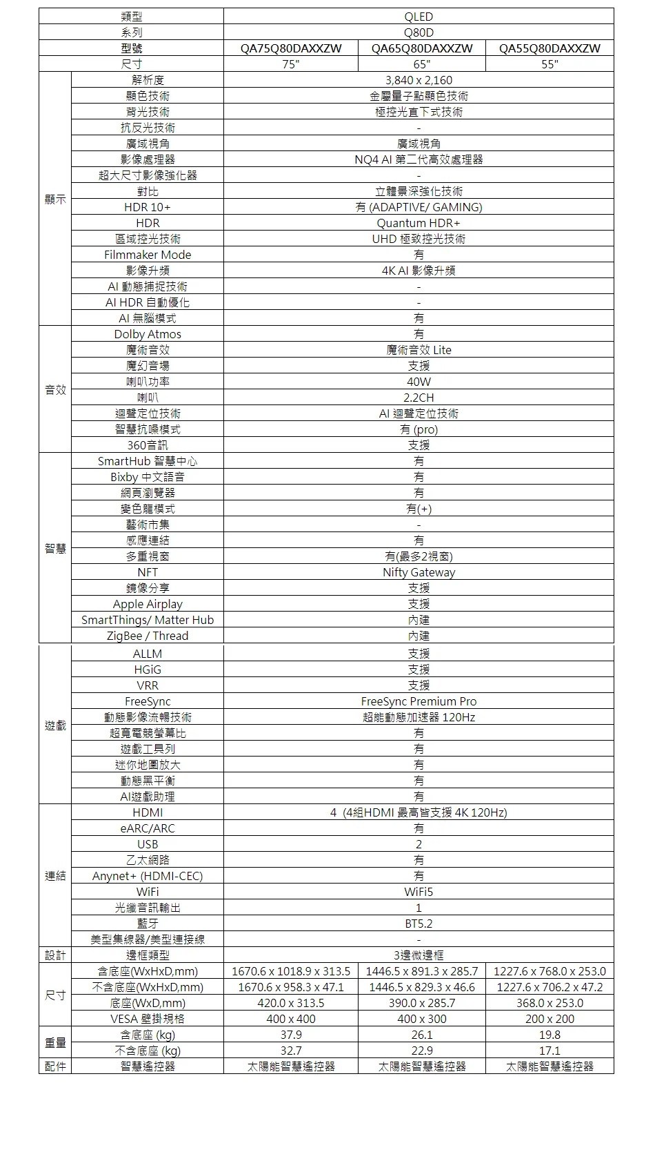 三星55吋4K連網QLED智慧顯示器QA55Q80DAXXZW(含標準安裝)
