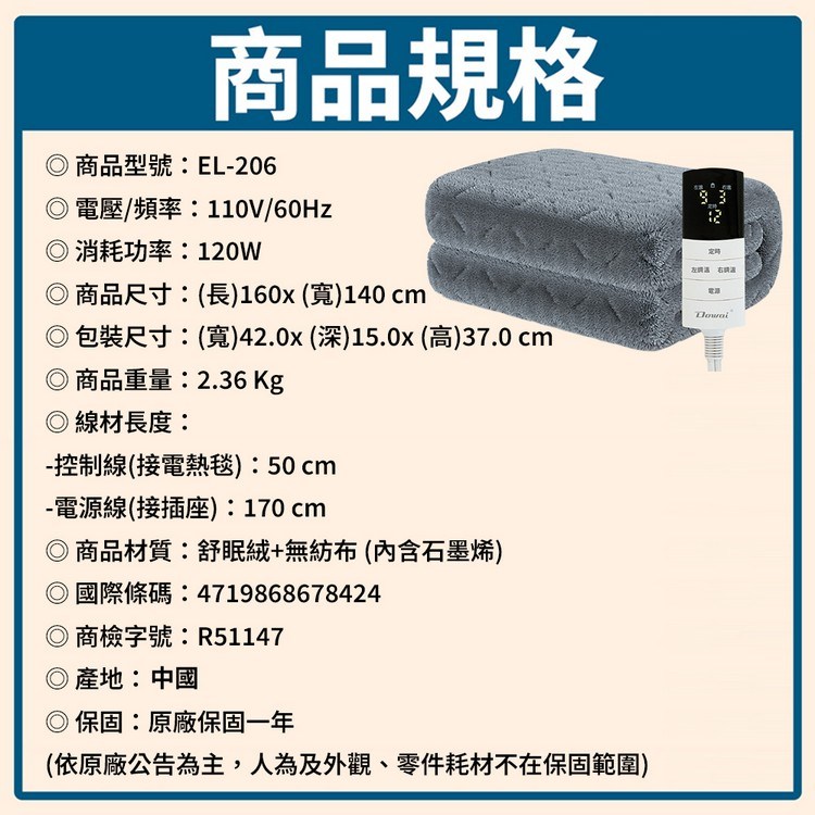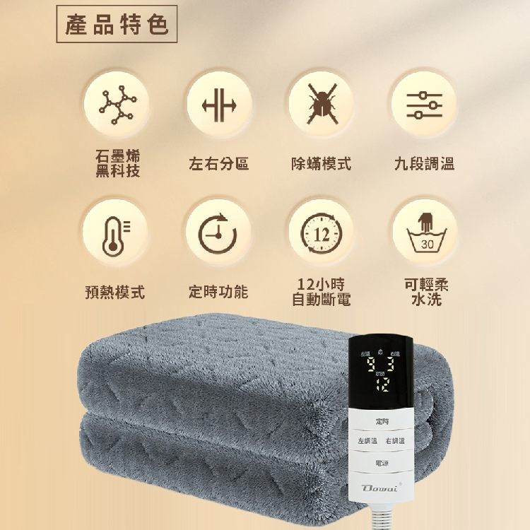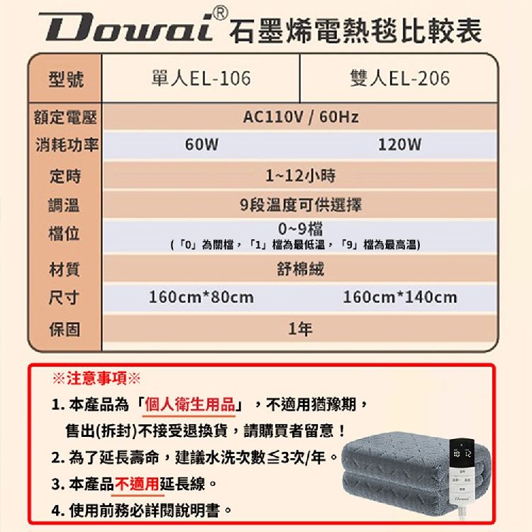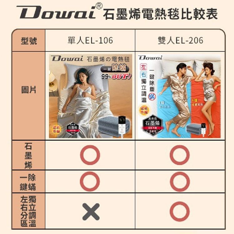 Dowai多偉 微電腦雙人獨立溫控可水洗石墨烯電熱毯 EL-206