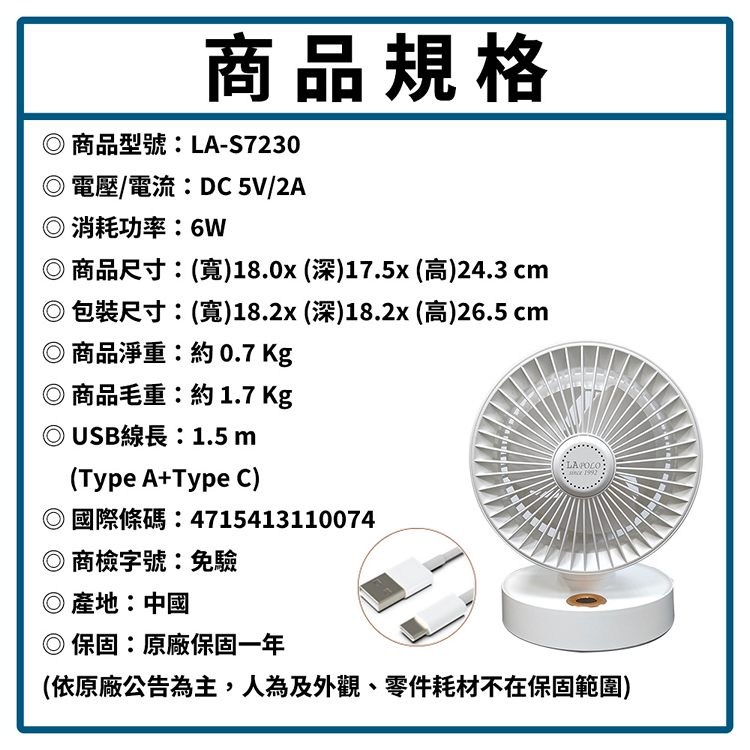 LAPOLO藍普諾 7吋USB擺頭風扇 LA-S7230