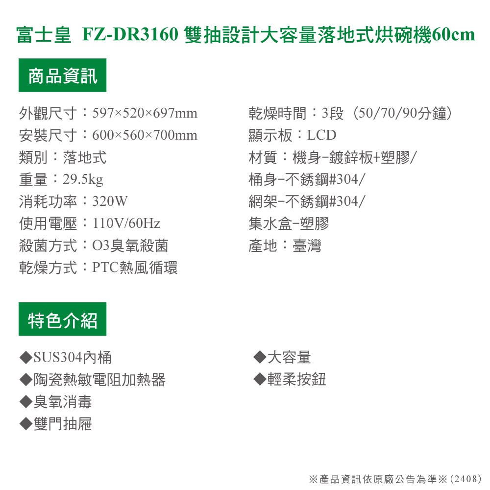 品名:雙抽設計大容量落地式烘碗機60cm