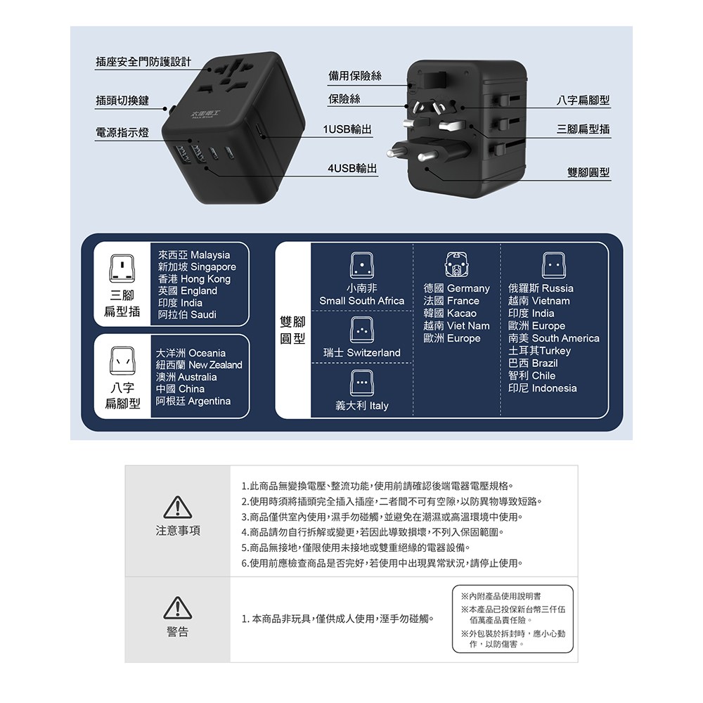 【聖岡科技Dr.AV】UTA-74萬國(八字扁腳)轉換插頭(無法轉換電壓 萬國插頭 阻燃 防火 中/紐/澳/斐濟)