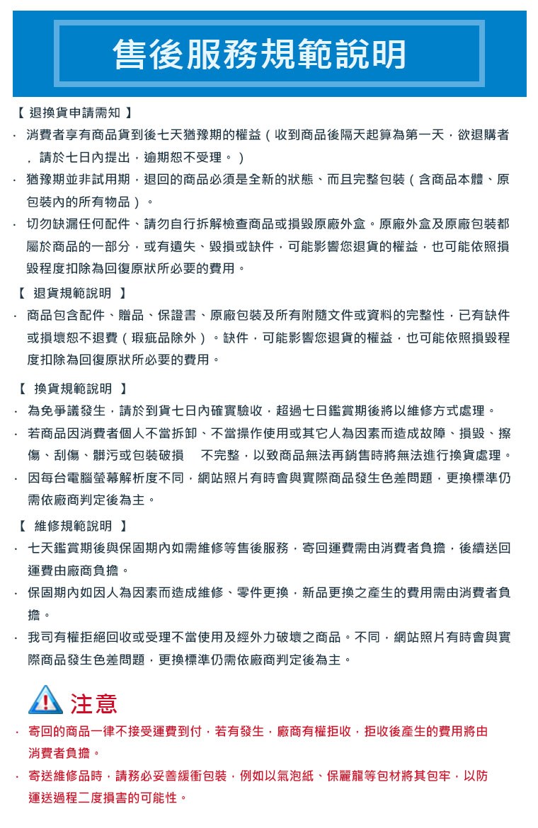 ✔️因產品材料和製造方面瑕疵所造成需維修和零件替換時得享免費維修或更換。