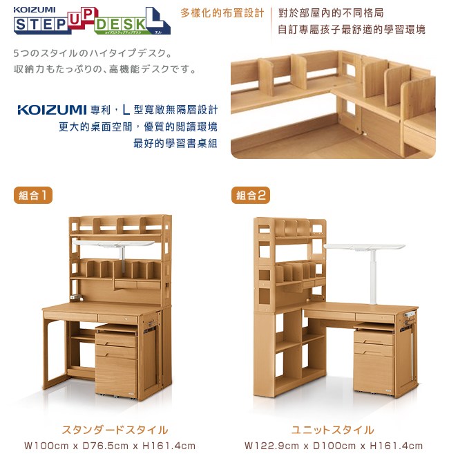 KOIZUMI 設計專利,L型寬敞無隔層設計,更大的桌面空間。五種組合模式,在任何地方、不同的年齡階段,都能使用的「成長學習桌」。寬敞的桌面、多樣細膩的收納設計,為孩子量身訂做的學習桌,能在起居/用餐室/兒童房/書房使用。當孩子還小時,父母可在起居/客廳的地方,陪同小孩一起學習,就近照顧。當孩子成長時,兒童房/書房,個人的生活空間,培養獨立自主。在最合適的地方,提供最舒適的學習環境。