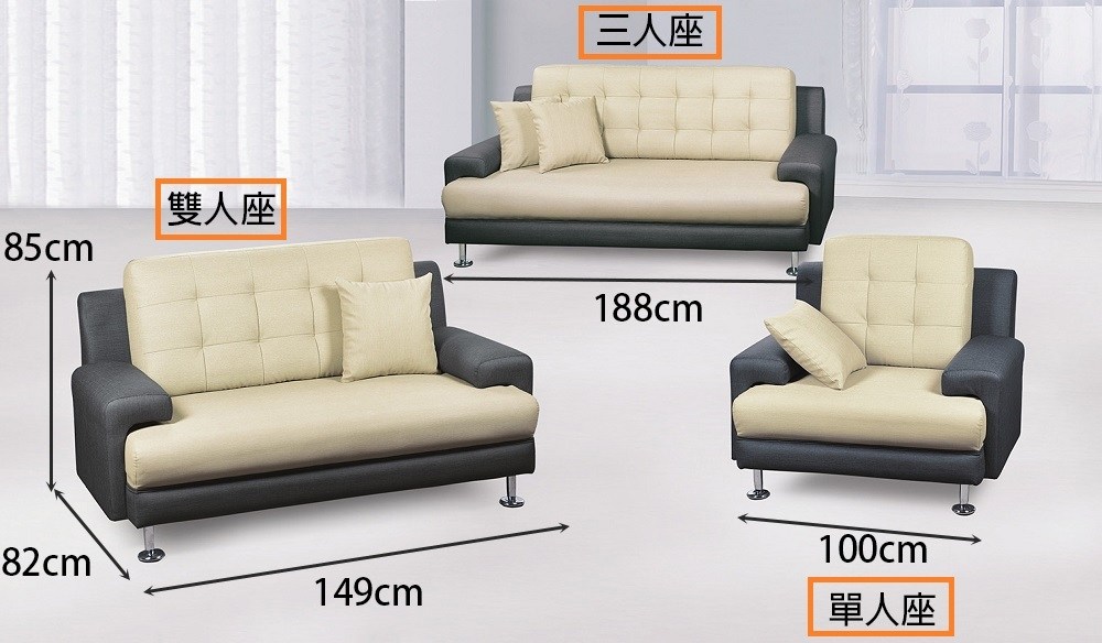 三人座 : 寬 188 公分 X 深 82 公分 X 高 85 公分。