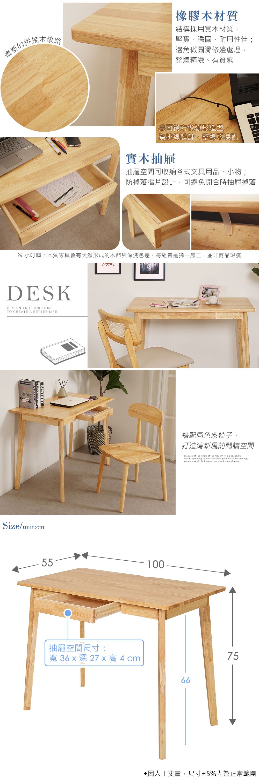 AOTTO 創意傢俱 北歐風實木桌腳單抽屜書桌 電腦桌 50 x 80 x 75cm 原木色