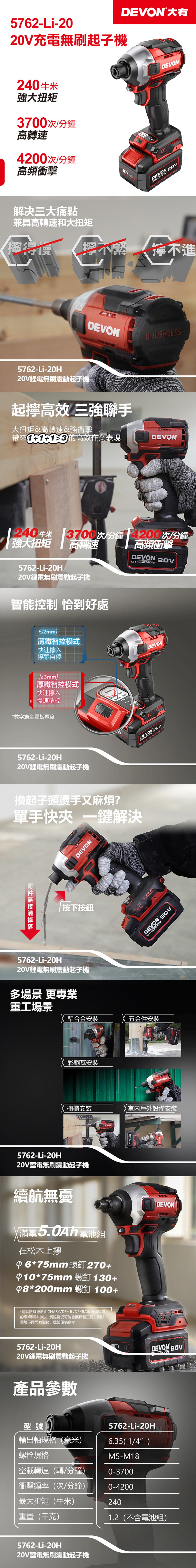 【DEVON大有】20V充電無刷電動板手 5760-Li-20(雙鋰電)