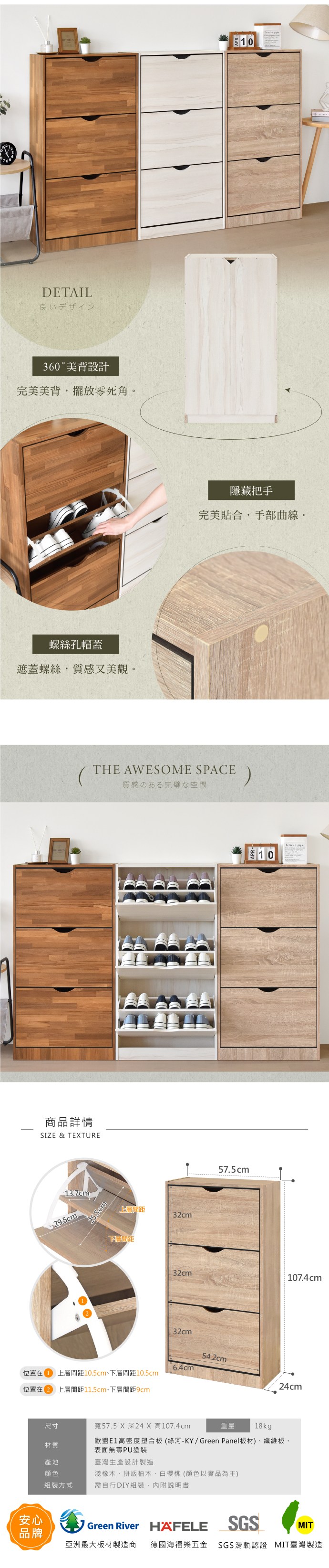 HOPMA家具 摩登三門五層鞋櫃 台灣製造 玄關收納櫃 置物邊櫃 鞋架-寬76 x深32 x高85.5cm;內徑深度30.5cm