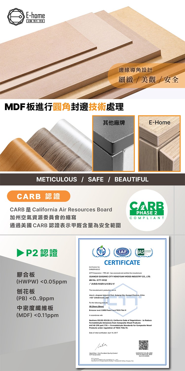 台灣與歐美同步販售、美規設計,CARB之P2認證MDF板材圓角封邊,防潑水PVC木紋皮包覆MDF板桌面,