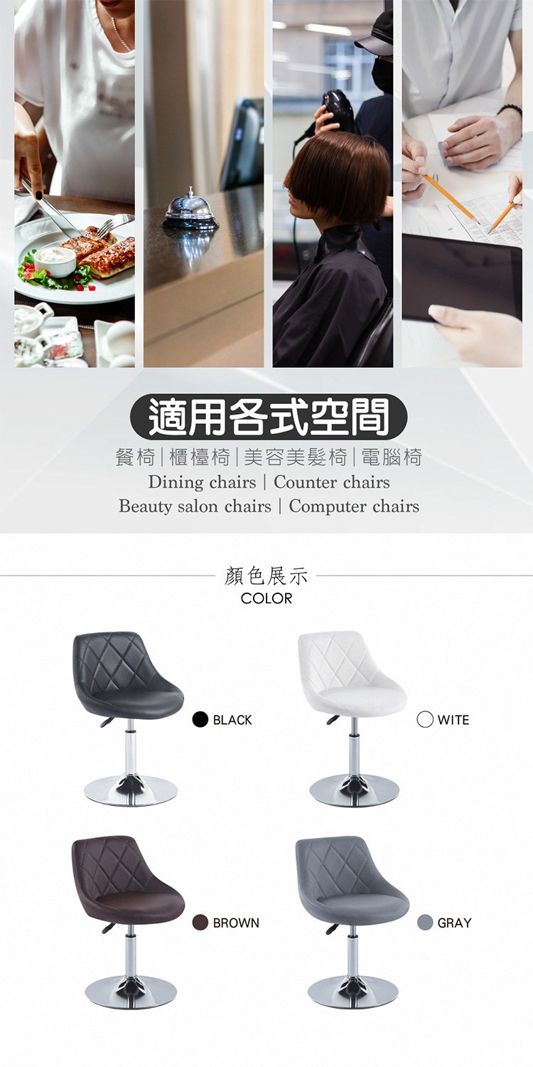 電鍍金屬圓盤腳、穩定且承重強,多功能適用各式空間,例如餐椅、櫃檯椅以及美容美髮椅和電腦椅,