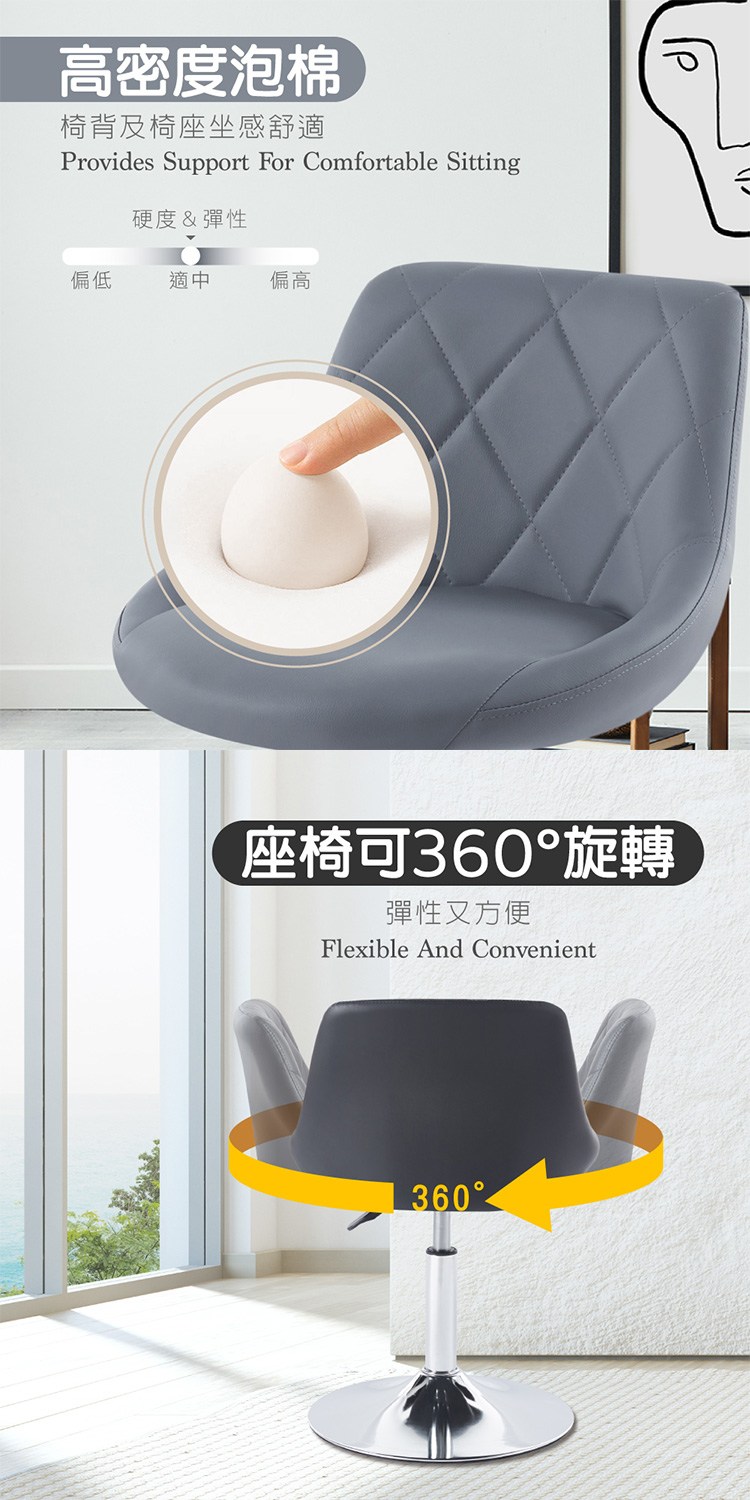 高密度泡棉椅背及椅座坐感舒適,座椅可360度旋轉,彈性又方便,配備美規A級氣壓棒、安全升降,