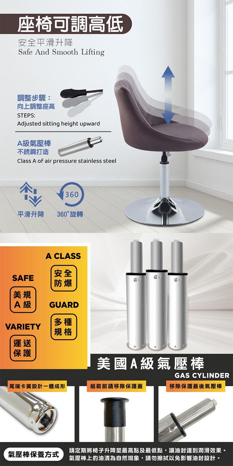 高密度泡棉椅背及椅座坐感舒適,座椅可360度旋轉,彈性又方便,配備美規A級氣壓棒、安全升降,