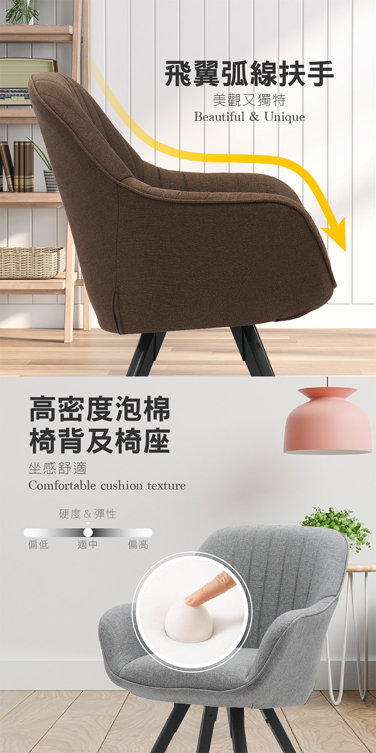飛翼弧線扶手設計,美觀又獨特,高密度泡棉椅背及椅座坐感舒適,椅座可彈性360°旋轉,靈活應用,
