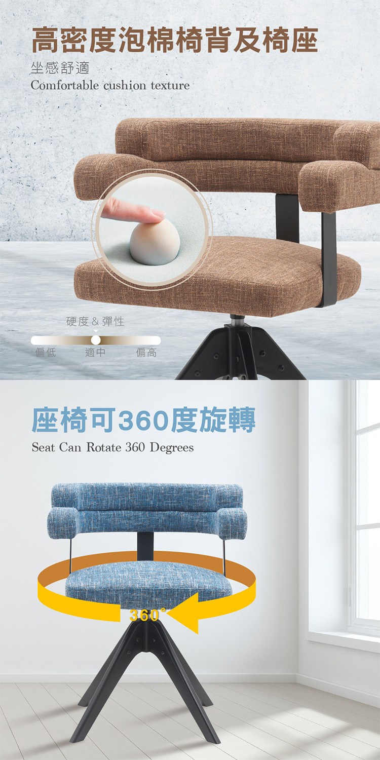 座椅使用可360度旋轉的旋轉底盤,A字實木黑漆椅腳、質感又耐用,附贈防刮腳墊、耐磨並保護地板,