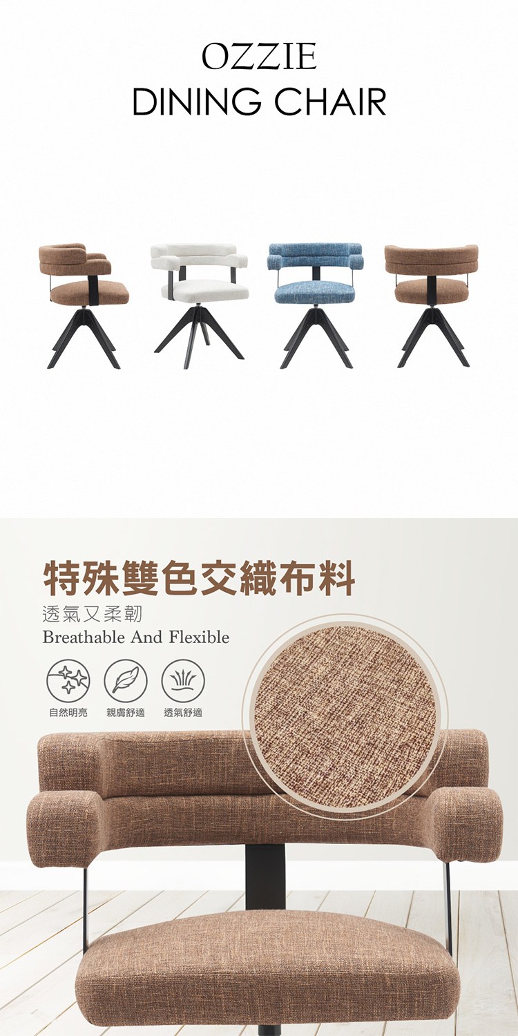 [E-home]Ozzie奧奇造型扶手布面實木腳旋轉餐椅,獨特造型別出心裁展現設計創意,豐富您的生活品味。
